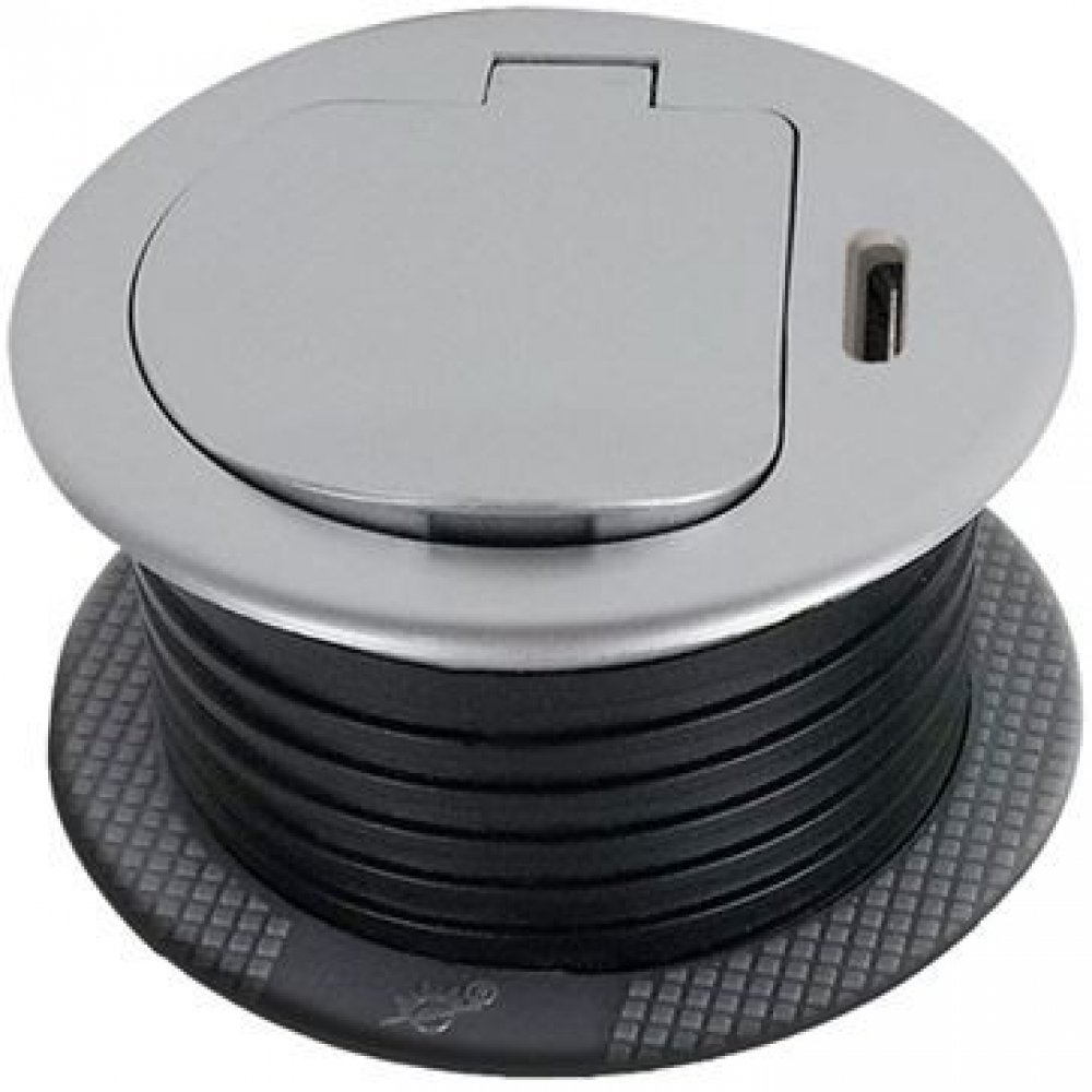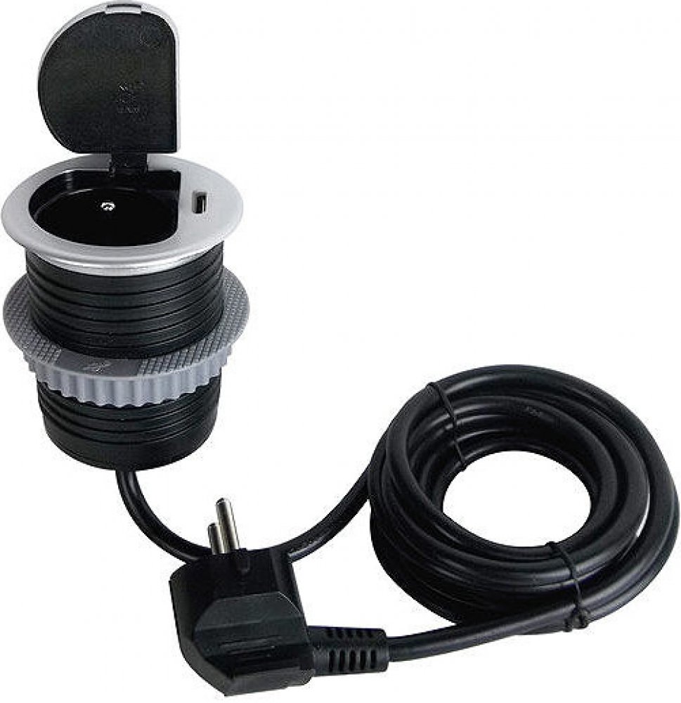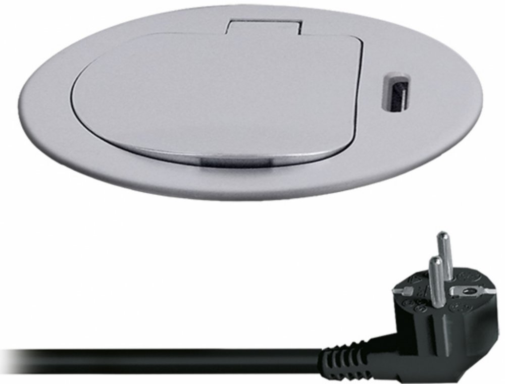 Zásuvka se instaluje do otvoru v pracovní desce a fixuje pomocí šroubovacího mechanismu. Nízký profil a stříbrné víčko umožňují snadné začlenění do moderního interiéru bez rušivých prvků. Po instalaci zůstává povrch čistý a přehledný, zásuvka je kdykoliv okamžitě k dispozici.