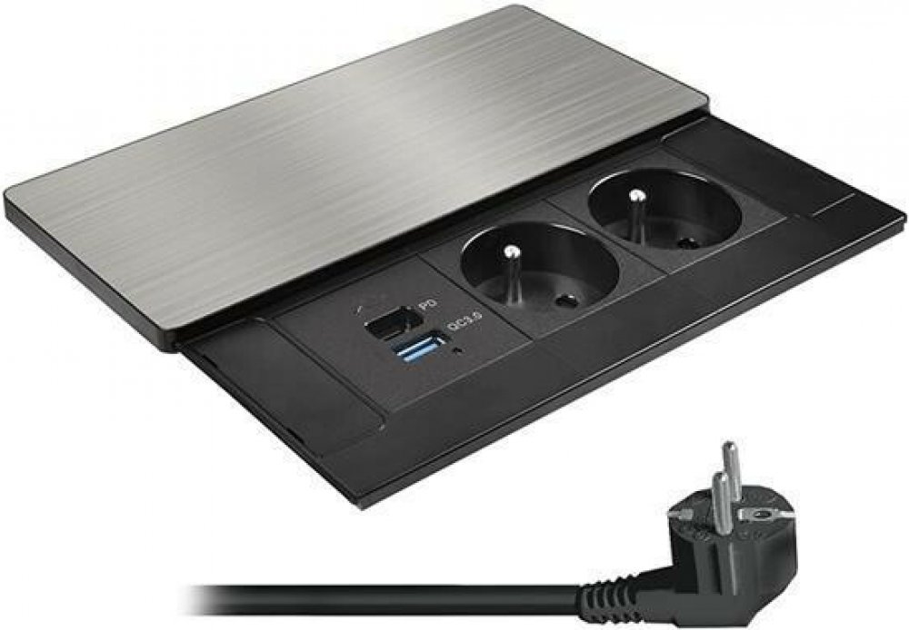 Elegantní vestavný zásuvkový blok s USB rychlonabíjením až 65 W – ideální pro stoly a kuchyňské linky. Tento vestavný blok kombinuje klasické elektrické napájení s moderním USB rychlonabíjením a přivádí energii přímo tam, kde ji nejvíce potřebujete – do pracovní desky nebo kuchyňské linky. Dvě zásuvky 230 V s dětskými pojistkami doplňují porty USB-A a USB-C s celkovým výkonem až 65 W, což postačuje i pro nabíjení notebooků a dalších náročných zařízení. Kryt z matného tmavého nerezu (inox) chrání zásuvky před prachem a zároveň působí elegantně v každém moderním interiéru. Nízký profil a posuvné otevírání šetří místo a nenarušují vzhled pracovní plochy. USB-C s technologií Power Delivery (PD) a USB-A s Quick Charge 3.0 zajišťují rychlé a efektivní nabíjení; výkon se při použití obou portů inteligentně rozděluje podle potřeby zařízení. Blok je připraven i na rozšíření – výměnou jedné zásuvky lze nainstalovat až dvě datové zásuvky RJ45 pro pevné síťové připojení. Navržen pro zátěž až 3680 W (16 A, 230 V~), s 2m napájecím kabelem a úhlovou vidlicí pro snadné připojení i za nábytkem. Instalace je rychlá – blok se vkládá do otvoru o rozměru 164 × 62 mm a fixuje pomocí přítlačných šroubů. Ideální řešení pro každodenní použití doma, v kanceláři i provozních prostorách.