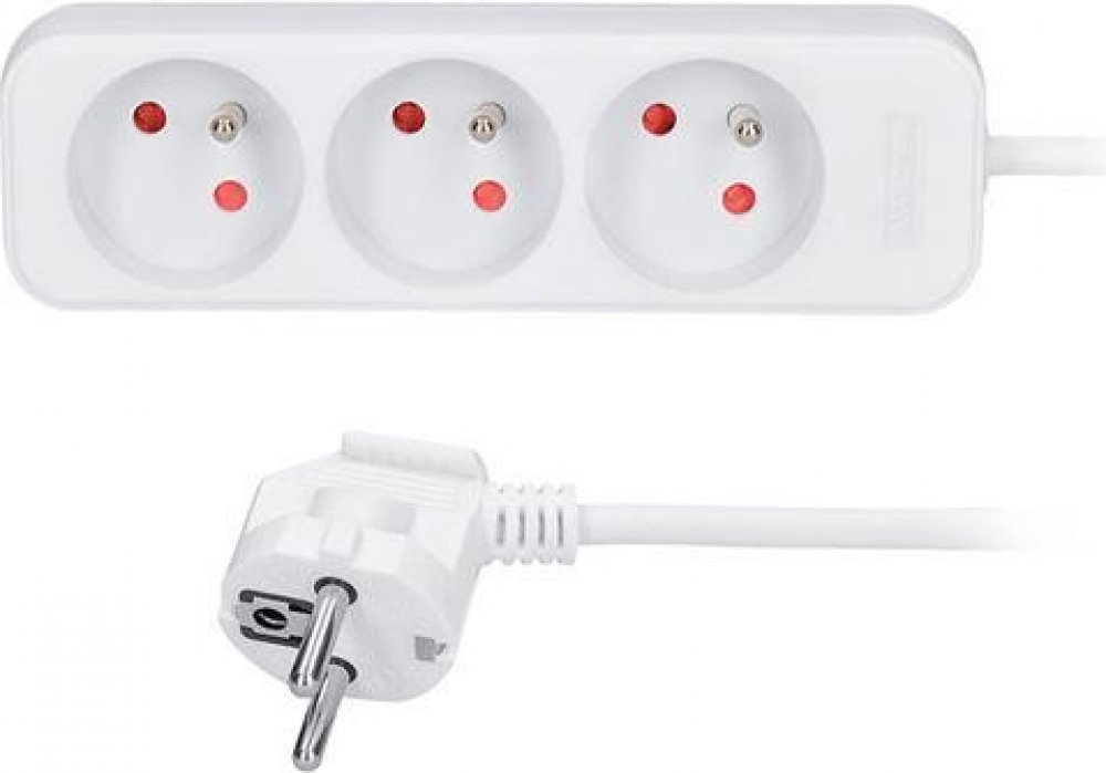Prodlužovací přívod Solight Technické parametry: - počet zásuvek: 3 - průřez vodičů: 3 x 1mm2 - typ kabelu: H05VV-F3 - lomená vidlice - barva: bílá - délka: 5m - 230V/10A