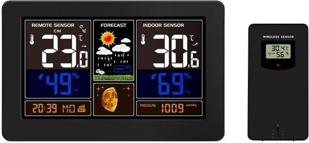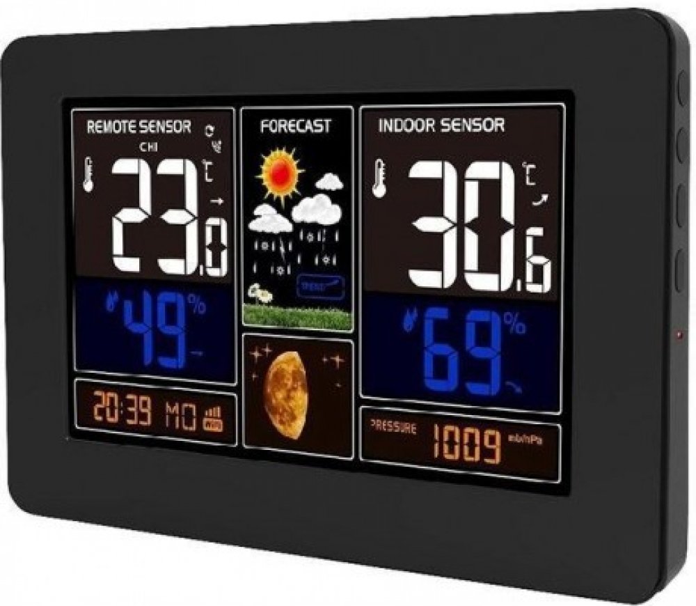 Tato meteostanice umožňuje ovládání prostřednictvím aplikace Smart Life/TYUA pro mobilní zařízení, která slouží k prohlížení grafů vývoje teplot, tlaku a vlhkosti, a ke kontrole aktuálních hodnot. Měří vnitřní teplotu (-20°C až +60°C), venkovní teplotu (-40°C až +70°C), vlhkost (20% - 95%) a atmosférický tlak (600 hPa/mb - 1100 hPa/mb). Má paměť minimálních a maximálních hodnot, připojení až 3 bezdrátových senzorů s dosahem 60 m, předpověď počasí v 6 grafických úrovních, indikátor vývoje počasí, čas řízený synchronizačním systémem internetu, kalendář, fáze Měsíce, název dne a indikátor komfortu. Barevný podsvícený displej o velikosti 19 cm (17,0 x 9,4 cm) s úsporným režimem a 3 úrovněmi podsvícení. Rychlý přístup k ovládacím tlačítkům a možnost montáže na zeď nebo použití s opěrným stojánkem. Napájení: adaptér AC 230V / DC 5V, 1200mA (součástí balení), nebo 2 x AA baterie (není součástí balení). Rozměry: 20,5 x 13 x 3 cm, barva: černá.