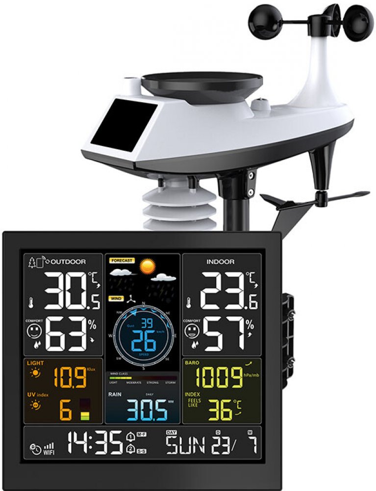 Profesionální smart WIFI meteostanice Tato profesionální meteostanice s velkým 24,4cm displejem nabízí WiFi připojení a propojení s aplikací Tuya/Smart Life pro zobrazení aktuálních hodnot a statistik. Měří vnitřní (-20 °C až 50 °C) a venkovní teplotu (-40 °C až 70 °C), vlhkost (20 % až 95 %), rychlost větru (0 až 180 km/h), směr větru (0–359°), srážky (0 až 9999 mm), atmosférický tlak (600–1100 h...