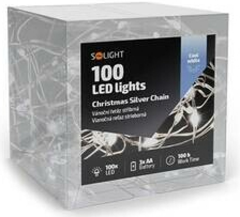 Solight vánoční řetěz stříbrný 100x mini LED 10m 3 x AA studené světlo