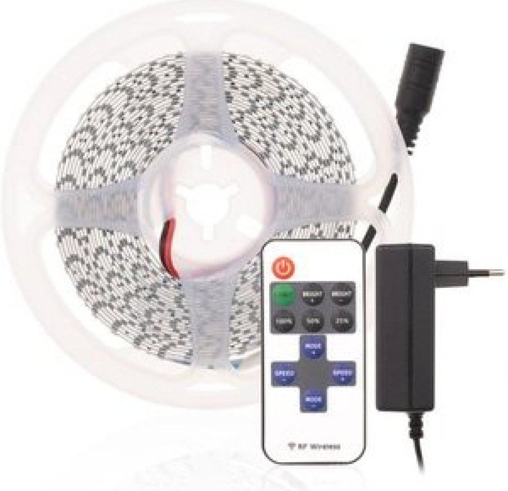 Sada LED pásku 12V-5M10W za příznivou cenu, která je určená především pro domácí použití. Kompletní sada LED pásku obsahuje 5m LED pásku, adaptérem do zásuvky a dálkový RF ovladač. LED pásek, adaptér i ovladač jsou opatřeny konektory pro jednoduché propojení mezi sebou. LED pásek je podlepen samolepící páskou, abyste ho mohli nalepit LED pásek na místo Vaší instalace. LED pásky v sadě můžete zkrac...