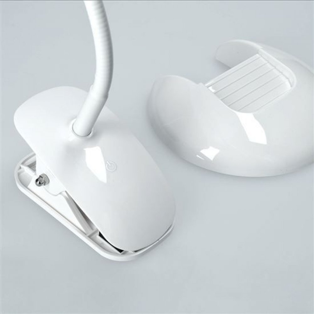 Lampička obsahuje připínací klip i podstavec pro umístění na stole.
