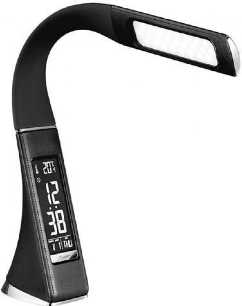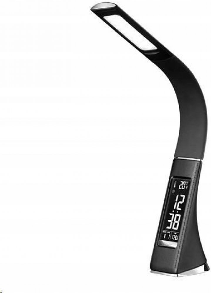 stolní lampička s LED světelným zdrojem a designem černé kůže stmívatelná – 3-stupňové stmívání displej s funkcí času, kalendáře, budíku a teploměru příkon světla: max. 6W světelný tok: max. 300lm teplota světla (chromatičnosti): 4100K (neutrální bílá) otočná a nastavitelná hlava lampičky protiskluzová základna s dotykovým vypínačem barva: černá napájení: AC 100-240V délka napájecího kabelu: 140cm energetická třída: G LED zdroj nelze měnit materiál: ABS + PS