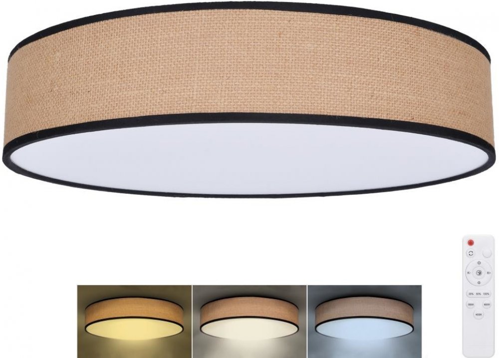 Elegantní verze svítidla Brownie o průměru 500 mm a maximálním výkonu 60W představuje výkonnější variantu oblíbeného dekorativního osvětlení. I zde si můžete pomocí přiloženého dálkového ovladače nastavit intenzitu světla, měnit teplotu chromatičnosti od 3000K po 6500K, nebo přepínat mezi oblíbenými režimy svícení. Dekor režné juty vnáší do místnosti přirozené teplo a jedinečný vizuální efekt.
