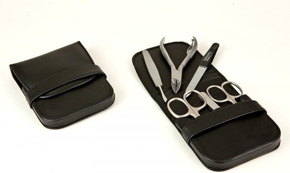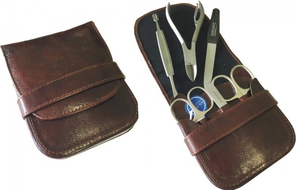 Nástroje v této manikúře jsou vyrobeny z kvalitní německé oceli značky Solingen. Pouzdra jsou vyrobena z kůže.