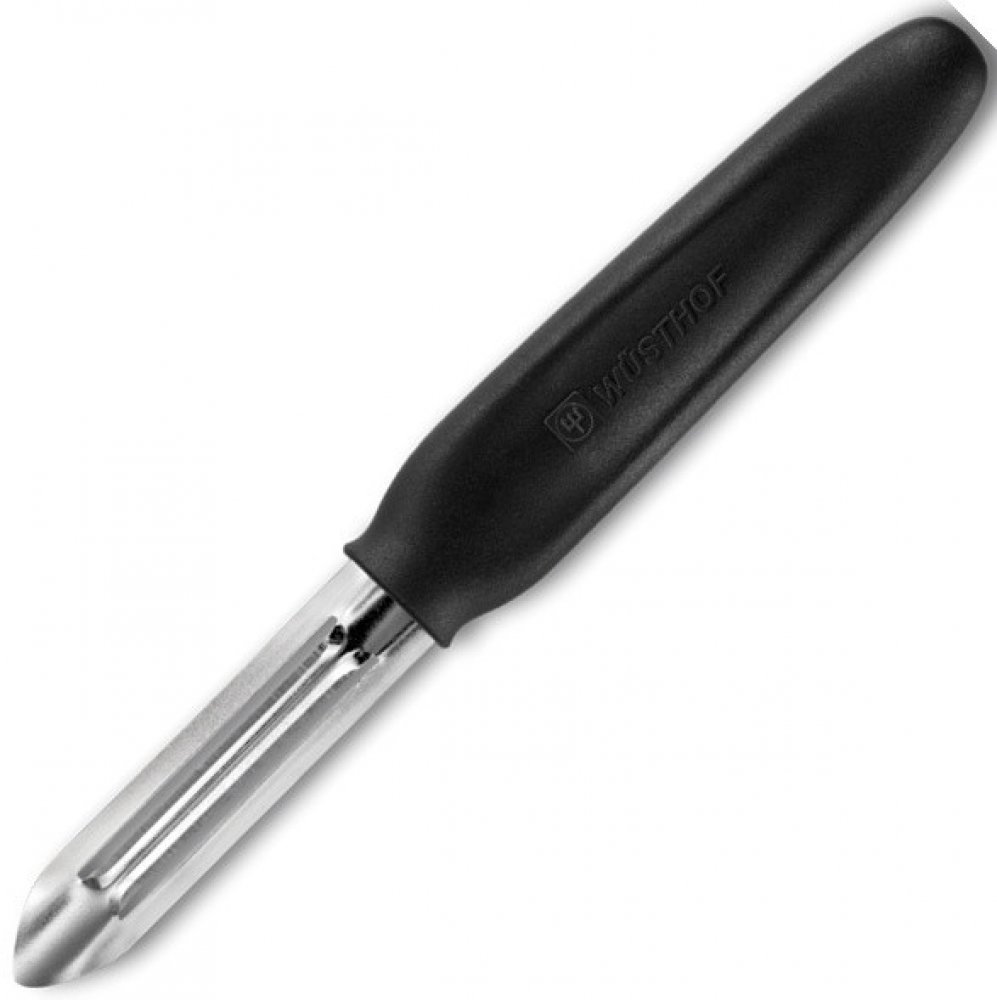 Škrabka na brambory s pevnou čepelí je vhodná na loupání potravin s tvrdší kůrou (brambory, jablka). Úzká drážka umožňuje jemné odstranění kůry. Ostrá špička slouží k rychlému a snadnému odstranění kazů na zelenině.