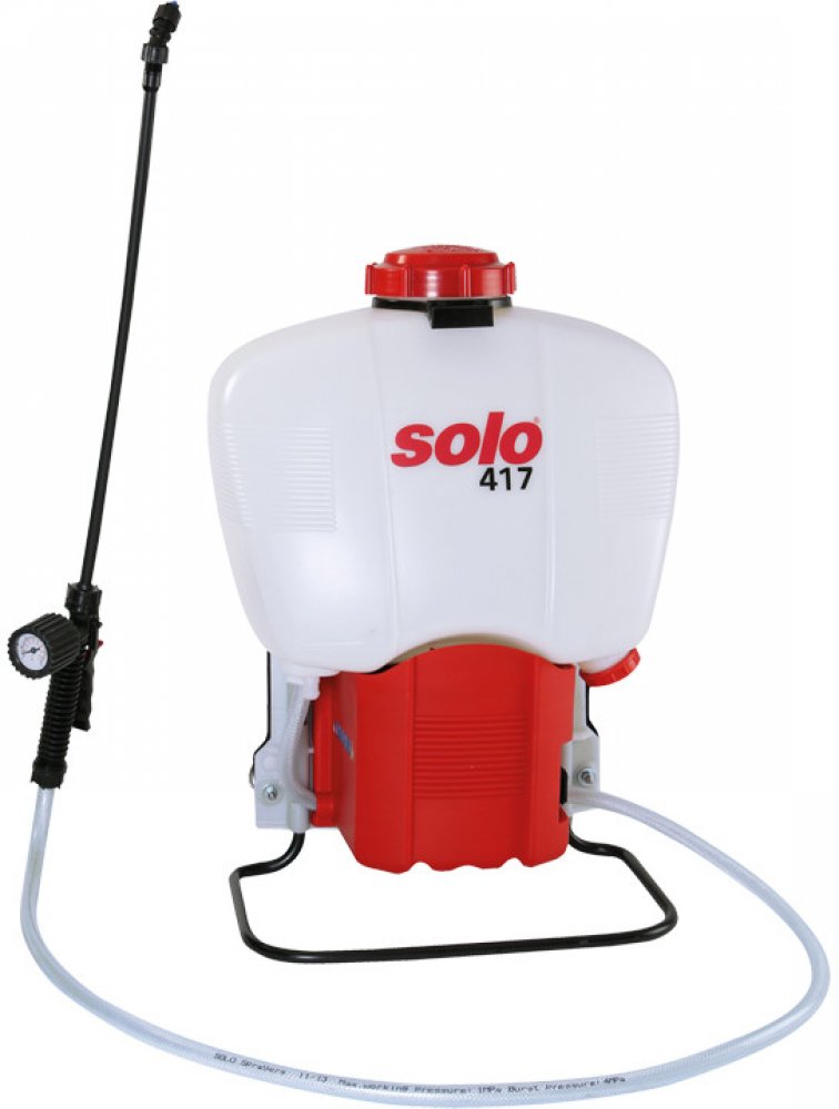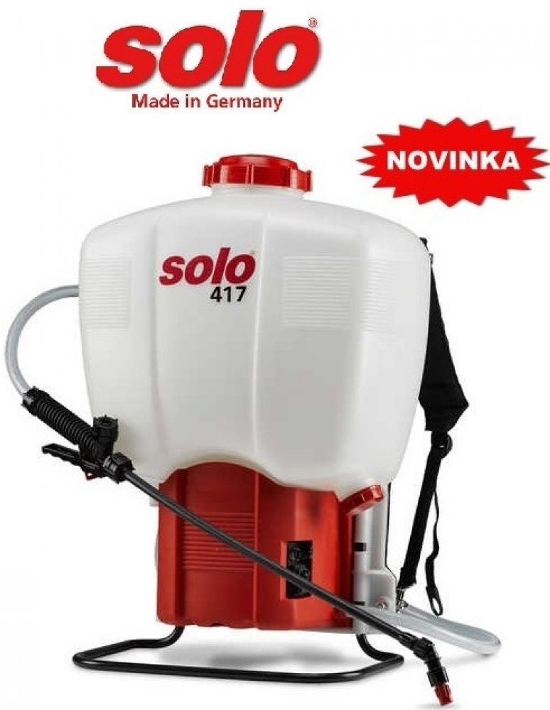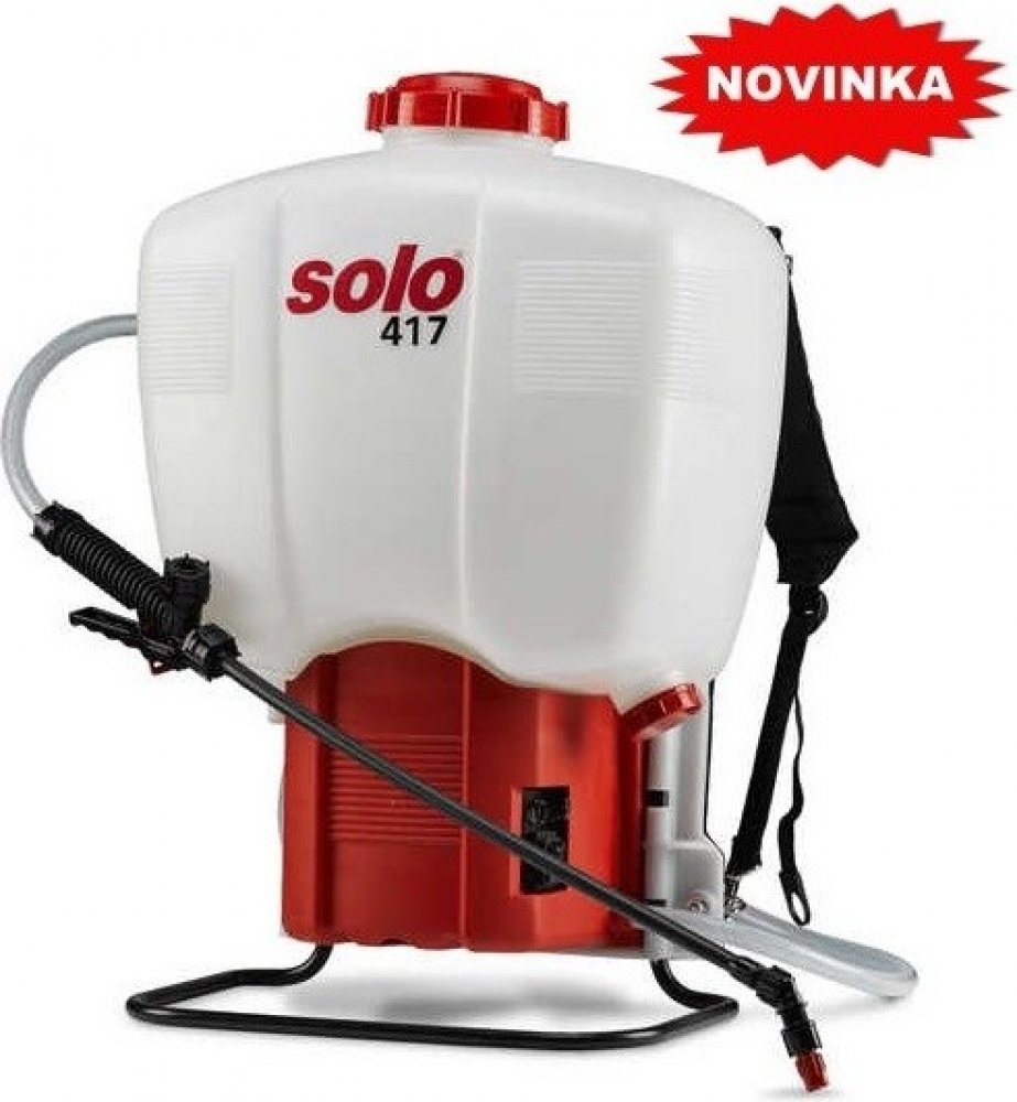 SOLO 417 je bezemisní, tiché s pohodlné řešení postřikovaní. Průhledná nádrž o objemu 18 litrů je vyrobena z plastového materiálu, odolného vůči nárazům a také vlivům UV záření. Silné dvoustupňové 12 V čerpadlo umožňuje tlak až do 4,3 bar spolu s výkonem 1.07 l/min nebo 1.42 l/min (podle nastaveného tlaku). Nízká váha stroje umožňuje i dlouhotrvající práci. Prázdnou baterii je možno nabít za několik málo hodin za pomocí dodávané nabíječky, která obsahuje i zásuvkové adaptéry.