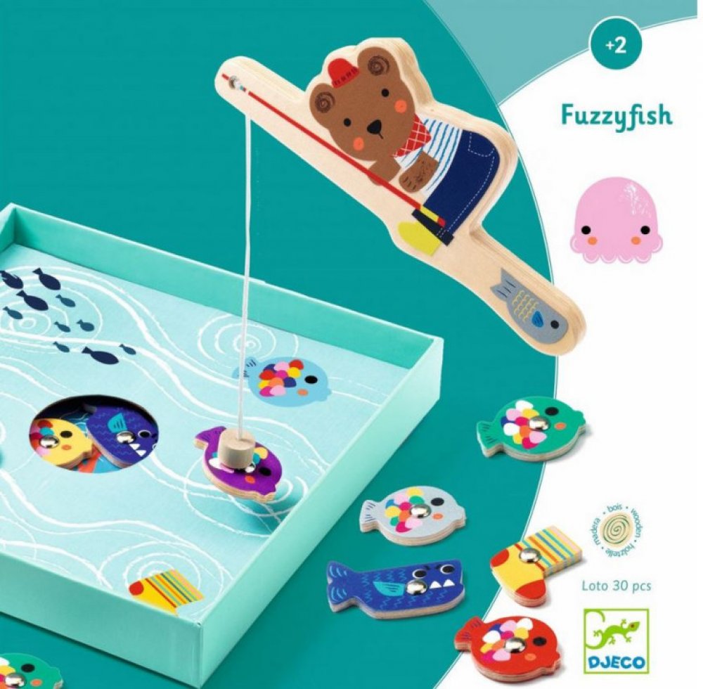 Obsah: 12 rybiček , 1 rybářský prut (dřevo, plast, magnet), 1 kryt s otvorem (plast a dřevo).