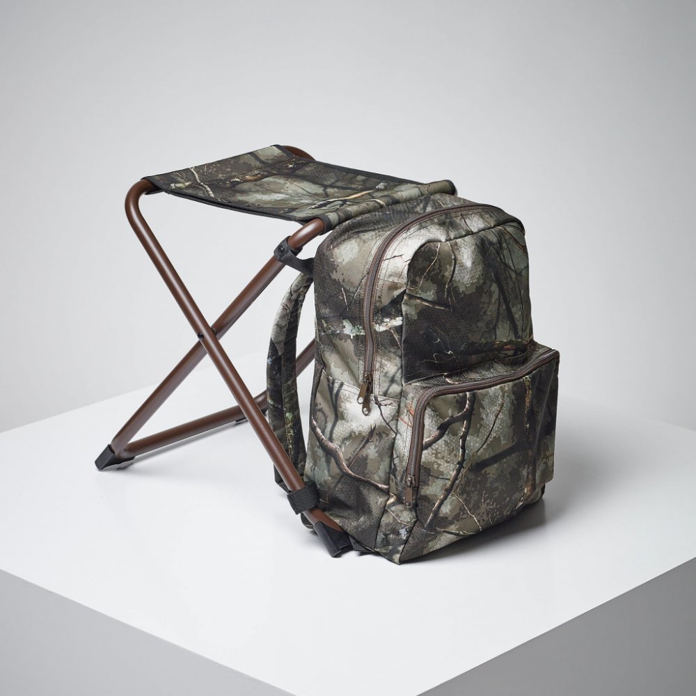 Maskovací skládací sedačka je díky integrovanému 25l batohu velmi praktická.