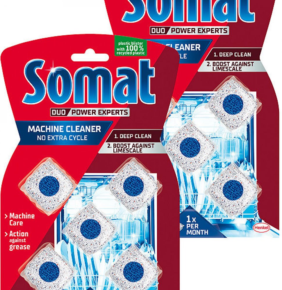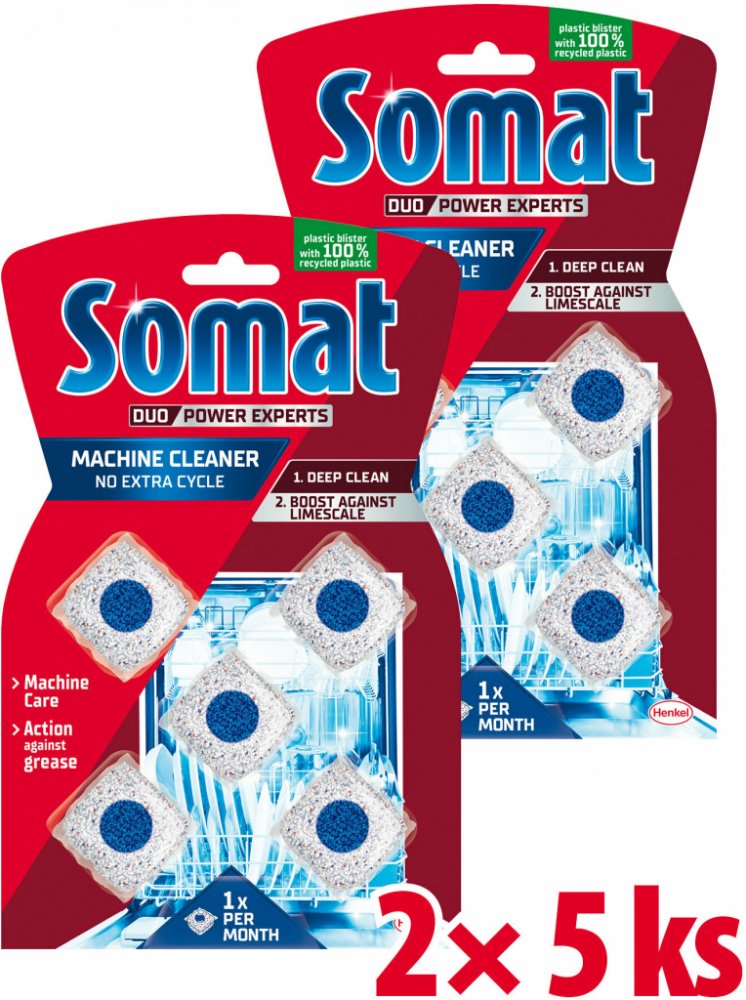 Čistič myčky Somat účinně bojuje proti vodnímu kameni a usazeninám, zároveň odstraňuje mastnotu, nepříjemný zápach i zbytky nečistot. Lze ho pohodlně použít během běžného mycího cyklu bez nutnosti spouštět myčku naprázdno. Stačí vložit tabletu na dno naplněné myčky a spustit program jako obvykle. Pro pravidelnou údržbu se doporučuje použití jednou měsíčně. Podporuje tak dlouhodobou životnost i účinnost spotřebiče. Balení je vyrobeno ze 100% recyklovaného plastu, a je tak šetrnější k přírodě. V balení najdete 2× 5 kusů. Klíčové vlastnosti čističe myčky SOMAT v tabletách, 2× 5 ksČistič myčky SOMAT bojuje proti vodnímu kameni a usazeninámOdstraňuje mastnotu, zápach i zbytky nečistotLze ho použít během běžného mytí bez nutnosti prázdného cykluTabletu stačí vložit na dno naplněné myčkyDoporučuje se používat jednou měsíčně pro pravidelnou údržbuČistič myčky SOMAT podporuje dlouhodobou životnost a účinnost myčkyBalení je vyrobeno ze 100% recyklovaného plastu