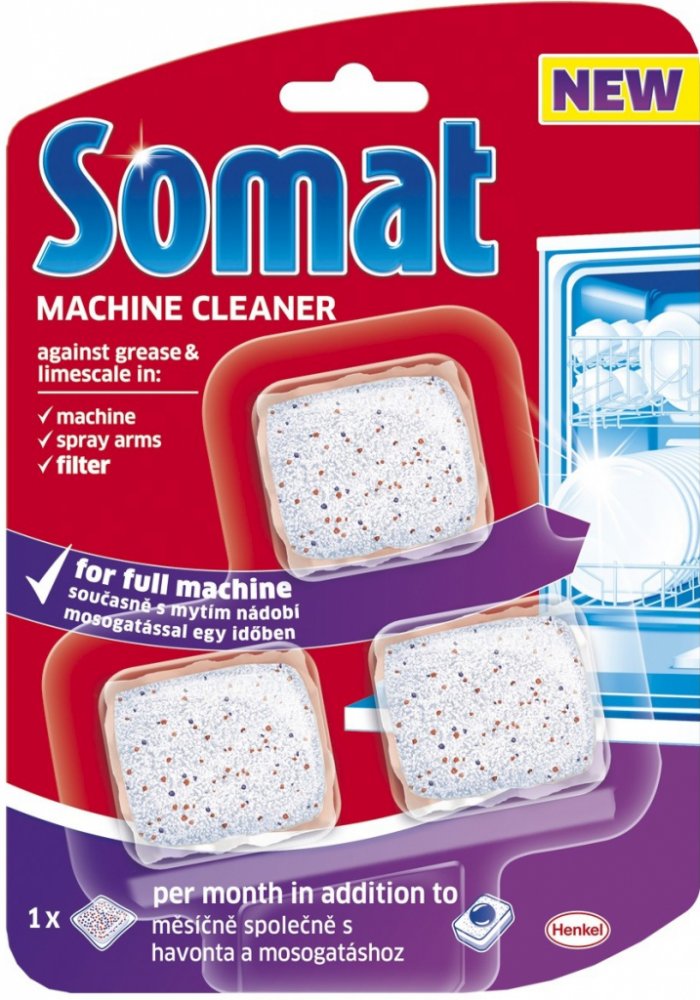 Čistič Somat Machine Cleaner je čisticí prostředek speciálně určený do myček na nádobí. Balení obsahuje tři tablety, které lze použít během běžného cyklu mytí nádobí při plné myčce. Předností čističe je jeho působení hluboko v myčce, kdy účinně odstraňuje veškerou mastnotu a usazeniny vodního kamene, a to jak ve stříkacích tryskách, tak i ve filtru. Přípravek je vhodný pro použití se všemi druhy n...