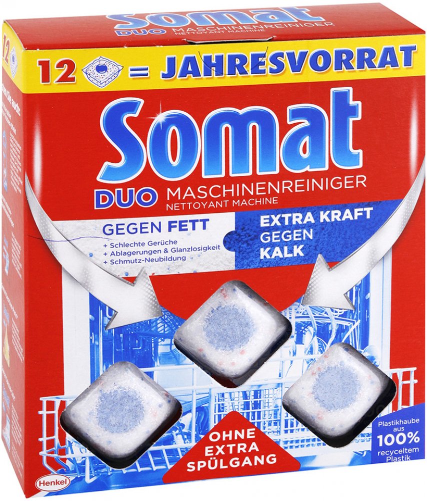 Somat Duo Power Experts - čisticí tablety do myčky proti vodnímu kameni Voda z vodovodu obsahuje vodní kámen, který může zanechávat zbytky na nádobí a v myčce. Čisticí tablety Somat bojují proti odolným usazeninám vodního kamene a zajišťují dokonale čistou myčku nádobí! Somat čistič myčky odstraňuje také mastnotu, pachy a usazeniny nečistot při pravidelné péči o myčku. Pro čištění a odstranění vodního kamene stačí před mytím nádobí umístit kartu na dno naplněné myčky a spustit požadovaný mycí cyklus. Plastová kapsa čističe myčky Somat je vyrobena ze 100% recyklovaného plastu.Výhody výrobku na první pohled:Bojuje proti usazeninám vodního kameneÚčinný proti usazeninám mastnoty, zápachu a špínyNení nutný žádný další mycí cykluspoužití jednou měsíčněPoužití:Naplňte pračku jako obvykle.Přidejte mycí prostředek jako obvykle.Vymačkejte kartu z kartonu. Odstraňte plastový obal! Kartu vložte do pouzdra rozpustného ve vodě na dně naplněné pračky.Spusťte pračku s požadovaným programem.Žádný cyklus oplachování navíc - karty mycího prostředku Somat jsou vhodné pro použití během cyklu oplachování, čímž pomáhají šetřit vodu a energiiDokonalá péče o myčku - Díky svému účinnému složení bojují tablety proti vodnímu kameni, mastnotě, zápachu a usazování nečistot. Pro zářivě čistou myčku nádobí1x měsíčně - K údržbě myčky stačí jedna karta měsíčně. A pro intenzivní hloubkové čištění: Používejte intenzivní čistič myčky Somat každé 3 měsíceSnadné použití - Před mytím nádobí jednoduše umístěte kartu na dno myčky a spusťte požadovaný mycí cyklusRecyklovaný obal - Pro ekologičtější mytí myčky je plastový kryt čističe myčky Somat vyroben ze 100% recyklovaného plastu Čistící prostředky Somat vyčistí vaši myčku i bez dodatečného cyklu oplachování. Silné složení pomáhá nejen v boji proti usazeninám mastnoty, lesku, zápachu a nečistotám, ale také zabraňuje usazování vodního kamene. Somat Machine Cleaner Maxipack - čisticí prostředek - Výrobce: Henkel AG & Co. KGaA, Henkelstraße 67, 40589 Düsseldorf, Německo --- --- Signální slovo: Varování --- P101 V případě potřeby lékařské pomoci mějte po ruce obal nebo etiketu výrobku. P102 Uchovávejte mimo dosah dětí. P280 Používejte ochranu očí. P305+P351+P338 PŘI ZASAŽENÍ OČÍ: Opatrně několik minut vyplachujte vodou. Pokud je to možné, vyjměte kontaktní čočky. Pokračujte ve vyplachování. P337+P313 Pokud podráždění očí přetrvává: Vyhledejte lékařskou pomoc/ošetření. P405 Uchovávejte pod zámkem. P501 Odstraňte obsah/kontejner v souladu s vnitrostátními předpisy. --- H319 Způsobuje vážné podráždění očí. H335 Může způsobit podráždění dýchacích cest. Die Somat Pflege, die ohne extra Spülgang angewendet wird. Seine kraftvolle Formel hilft nicht nur gegen Fettablagerungen, Glanzlosigkeit, schlechte Gerüche und Anschmutzungen, sondern sorgt auch gegen die Entstehung von Kalkablagerungen in der Maschine und dringt dabei bis in Sprüharme, Filter, Wasserpumpe und Schläuche vor.