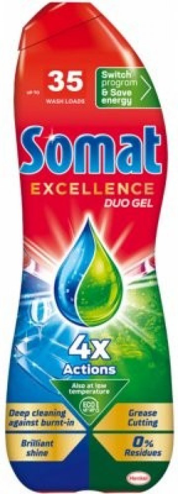 Somat gel do myčky 35 dávek Excellence 630 ml Duo Gel je multifunkční vysoce účinný tekutý prostředek na mytí nádobí, který kombinuje dvě navzájem se doplňující složení. Nejúčinnější řada Excellence. Působí proti připáleninám, mastnotě, odolným skvrnám a nečistotám. Rychle se rozpouští i při ekologických cyklech s nízkými teplotami. Nezanechává žádné zbytky a přináší zářivě čistý lesk po každém mycím cyklu. Lze použít na všechny materiály vhodné do myčky. Složení čisticího prostředku obsahuje aktivní odmašťovače pro čisté a lesklé nádobí při každém mytí. Funkce gelu Excellence: Chrání dekor vašeho nádobí, přináší zářivý lesk, funkce soli, dvoukomorový systém dávkování, ochrana stříbra, žádné zbytky, účinný již od nízkých teplot, funkce předmývání, účinně proti připáleninám a mastnotě.