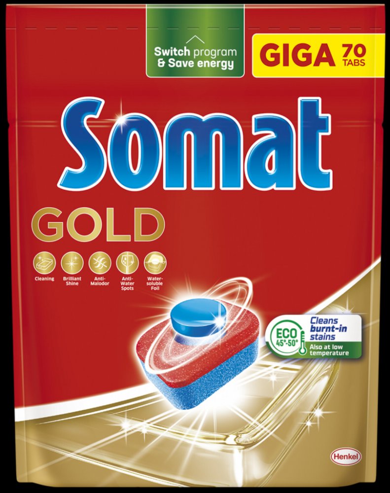 Značka Somat se rovněž zasazuje o čistší svět: tablety mají biologicky odbouratelnou a ve vodě rozpustnou fólii. Náš závod navíc pracuje se 100% obnovitelnou elektřinou a z naší výroby se nevyváží žádný odpad na skládky. Tablety do myčky Somat Gold jsou speciálně vyvinuty pro krátké a eco programy s nízkou teplotou. Přepněte program a ušetřete vodu a až 20 % energie* se Somatem!