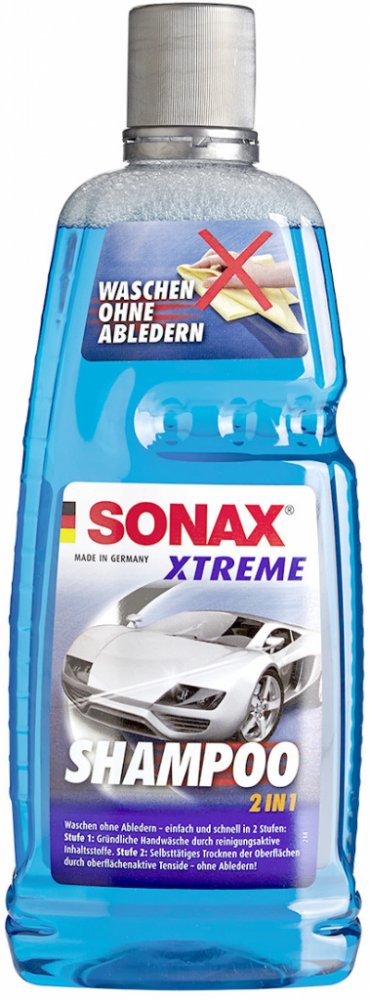 SONAX Xtreme aktivní šampon 2 v 1 - Mytí bez utírání. Účinný koncentrát k čištění všech lakovaných ploch, skel, plastů, pryže, porcelánových a kovových povrchů se speciální sušící složkou. Po umytí není zapotřebí používat jelenici, protože aktivní autošámpón sráží vodu. Silný koncentrát autošamponu s kombinací mycích a sušících účinků, důkladně odstraňuje veškeré nečistoty, rozpouští zatvrdlé nánosy nečistot, jako například zbytky zaschlého hmyzu a ptačí trus.