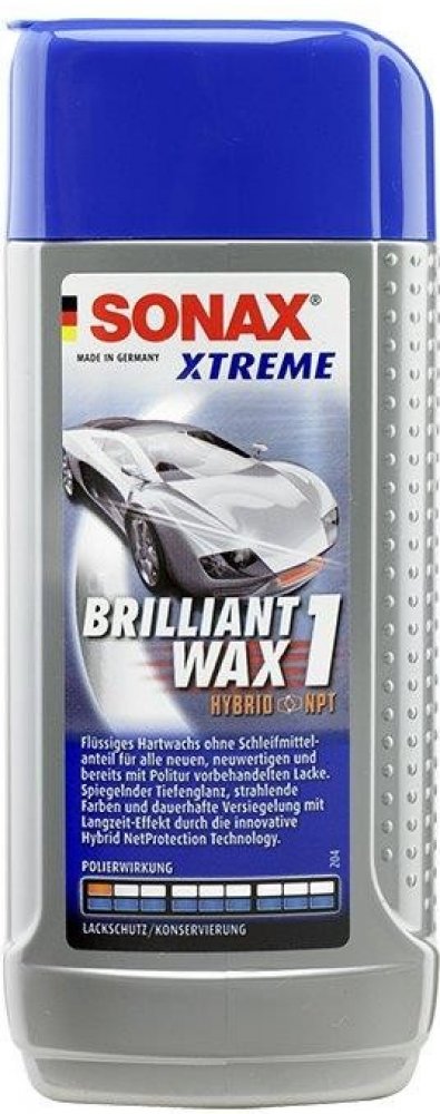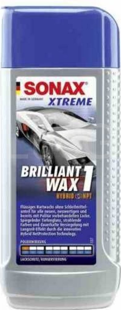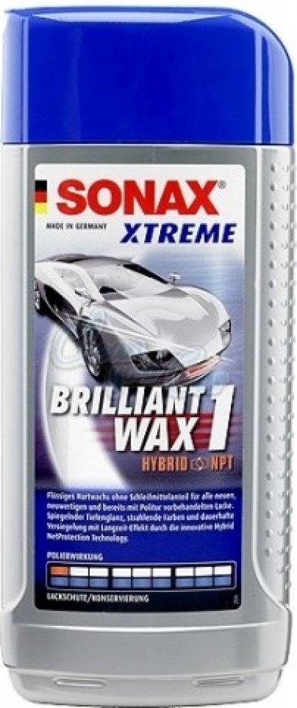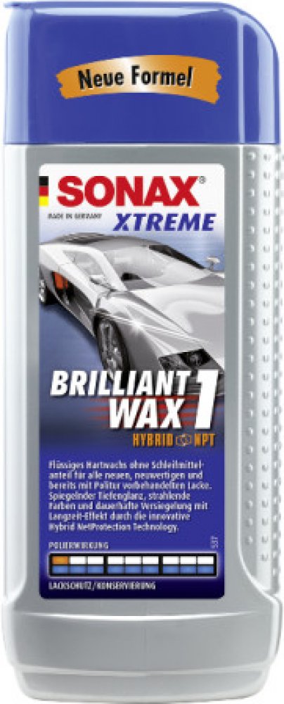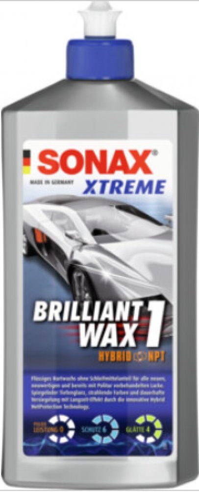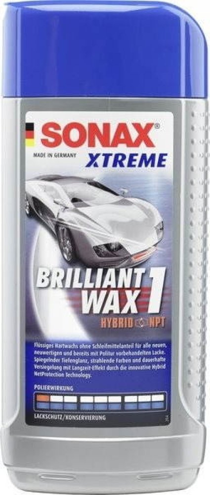Vosk Sonax Xtreme Brilliant Wax 1 Hybrid NPT - 500 ml Leštěnka s voskem pro dlouhodobou ochranu laku proti vlivům venkovního prostředí. Hybridní NetProtection technologie kombinuje speciální anorganické a organické složky s dlouhou životností a vynikající ochrannou vrstvou. Je vhodná pro všechny druhy laků, povrch zůstane po aplikaci velice hladký, vysoce lesklý a zaručuje odperlovací efekt. Anorganické sloučeniny zaručují dlouhodobou životnost, stabilitu a odolnost. Nezanechává bílé fleky a šmouhy na gumových a plastových částech vozu. Dlouhodobá ochrana je vhodná pro nové a vyzrálé laky. Neobsahuje brusné složky, obsahuje až 10x vyšší podíl kvalitních vosků. Nanáší se pouze v tenké vrstvě - nízká spotřeba na jeden vůz (jen cca 50 ml). Hybridní NetProtection technologie nahradila starší, zdraví škodlivou nanotechnologii - při dlouhodobých průzkumech byl prokázán průnik nanočástic do pokožky.