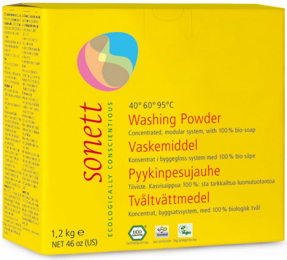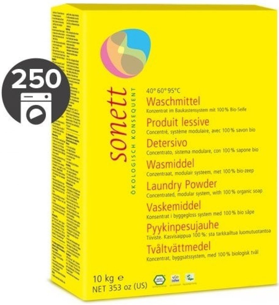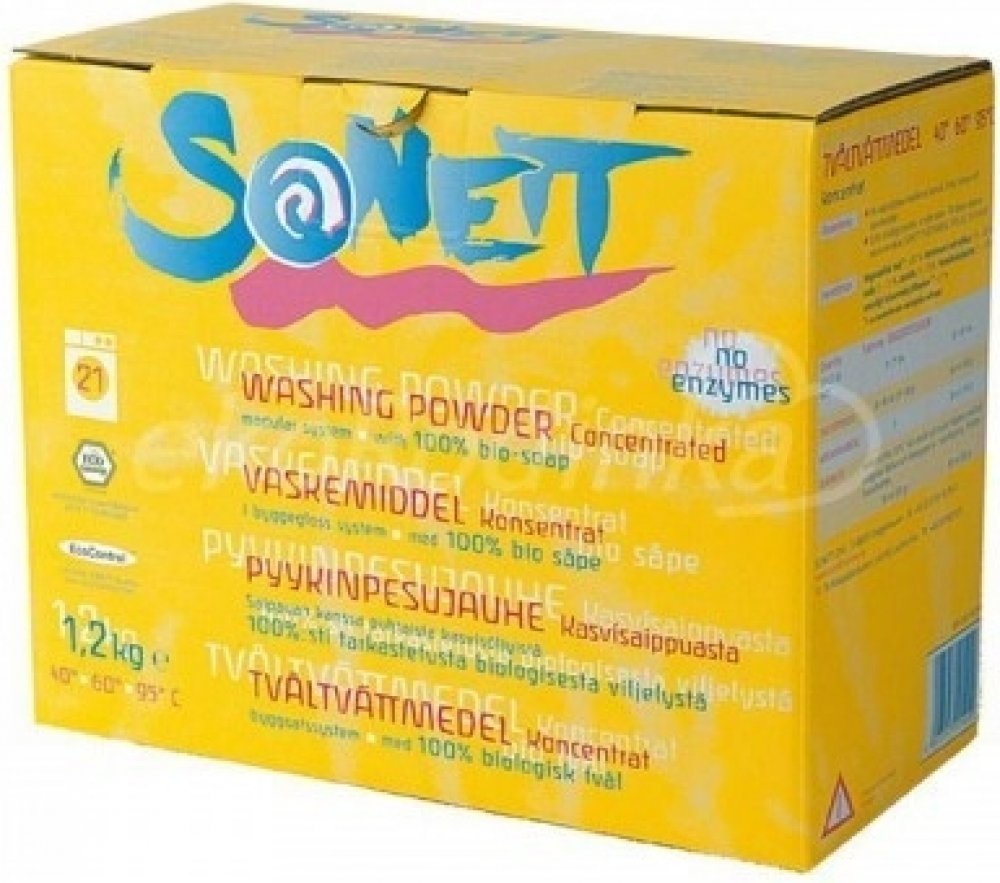 Prací prostředek SONETT obsahuje jako hlavní účinnou látku mýdlo které se vyrábí z různých rostlinných olejů, palmového, řepkového, kokosového a olivového, a to vařením s louhem. Oleje pocházejí zčásti z ekologické resp. bio-dynamické produkce. Mýdlo jako aktivní mycí látka v sobě jedinečným způsobem spojuje všechny, pro proces praní nezbytné, vlastnosti smáčení nečistoty, jejího rozpouštění a pohlcení. Soda se vyrábí přeměnou vápna pomocí kuchyňské soli. ORTOKŘEMIČITAN vzniká roztavením křemičitého písku a sody. Soda a ortokřemičitan posilují svou zásaditostí mycí louh a podporují uvolňování zejména mastných látek. Zeolit A a vrstevnatý křemičitan mají jako výchozí surovinu křemičité horniny. Vedle své vlastnosti poutat vápník ve vodě poutají tyto složky zároveň i organické látky rozpuštěné v prací vodě a barevné pigmenty a zabraňují jejich usazování na prádle. Derivát kokosového oleje podporuje mýdlo v jeho funkci rozpouštění tuků.