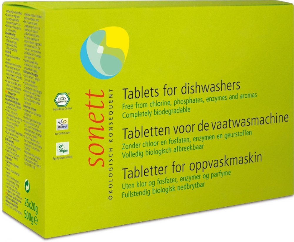 Tablety do myčky Sonett obsahují minerály a organické složky, které jsou plně biologicky odbouratelné. Neobsahují enzymy, agresivní chlorová bělidla, fosfáty ani vonné přísady.