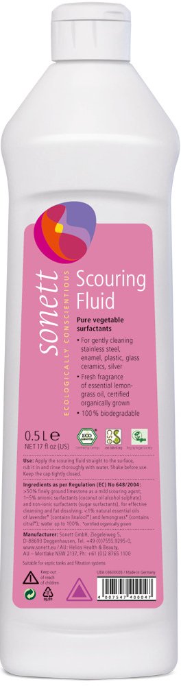Šetrně čistí nerezové, smaltované a plastové povrchy, sklokeramické varné desky, stříbro, kachličky a další kuchyňské a koupelnové vybavení. Hlavní složkou čistícího tekutého písku je čistý vápenný prášek, které je pozoruhodně jemné a šetrné. Díky použití směsi přírodních esenciálních olejů - levandule a citronové trávy - je dosaženo lehkého mikrobiálního inhibičního účinku.