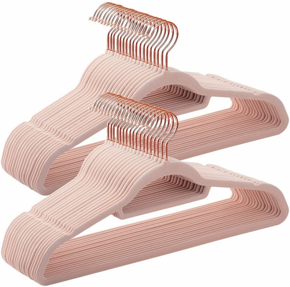 Háček v barvě růžového zlata zdobí tento elegantní věšák potažený plyšovým sametovým povrchem. S tloušťkou pouhých 0,6 cm šetří tato štíhlá ramínka místo ve stísněné skříni. Pokud vás už nebaví sbírat oblečení, které vždy sklouzává na podlahu, pak tato sada protiskluzových ramínek stojí za vyzkoušení; jemný, neklouzavý sametový povrch drží na oblečení těsněji.