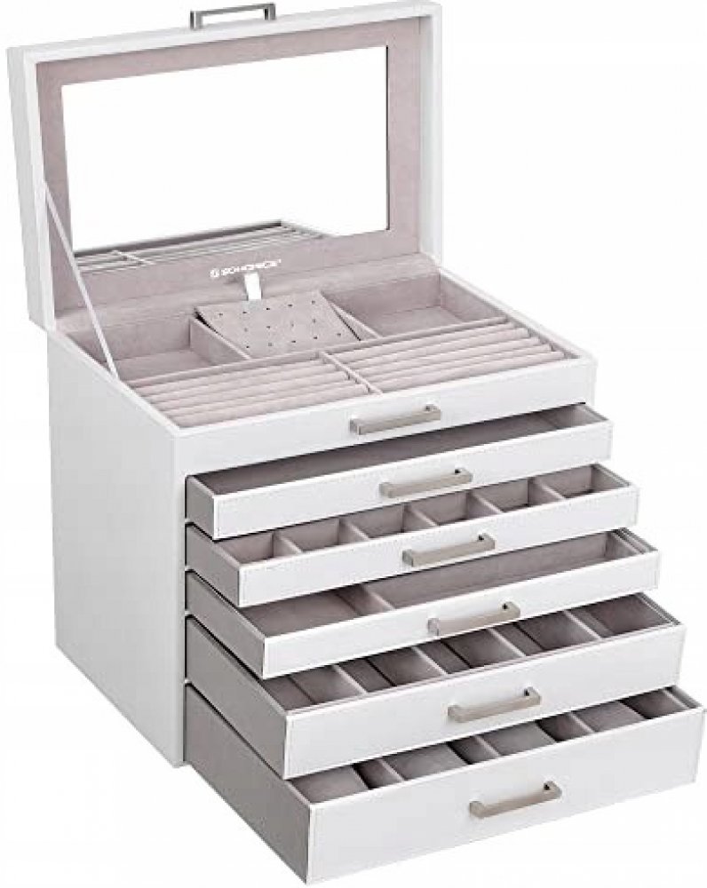 Šperkovnice Houseland je perfektní volbou pro ochranu vašich klenotů. Je vyrobena z pravé kůže, nabízí proto luxusní vzhled a dlouhou životnost. Praktické zrcátko vám hned ukáže, který šperk se k vašemu outfitu nejlépe hodí. Budete vždy vědět, kde se nachází každý šperk, protože šperkovnice Houseland obsahuje navíc 5 zásuvek. Klíčové vlastnosti šperkovnice Houseland Designová šperkovnice se zrcátk...