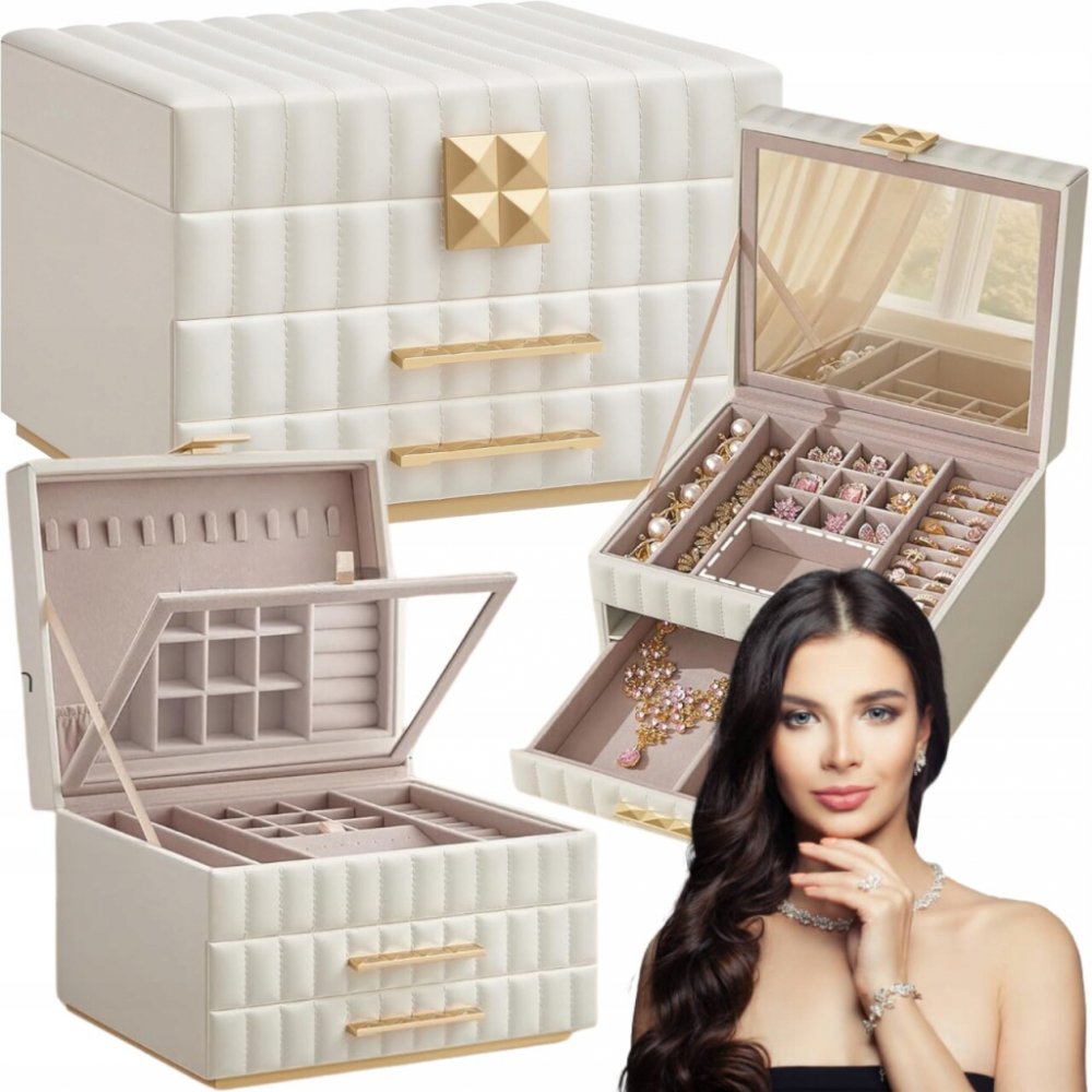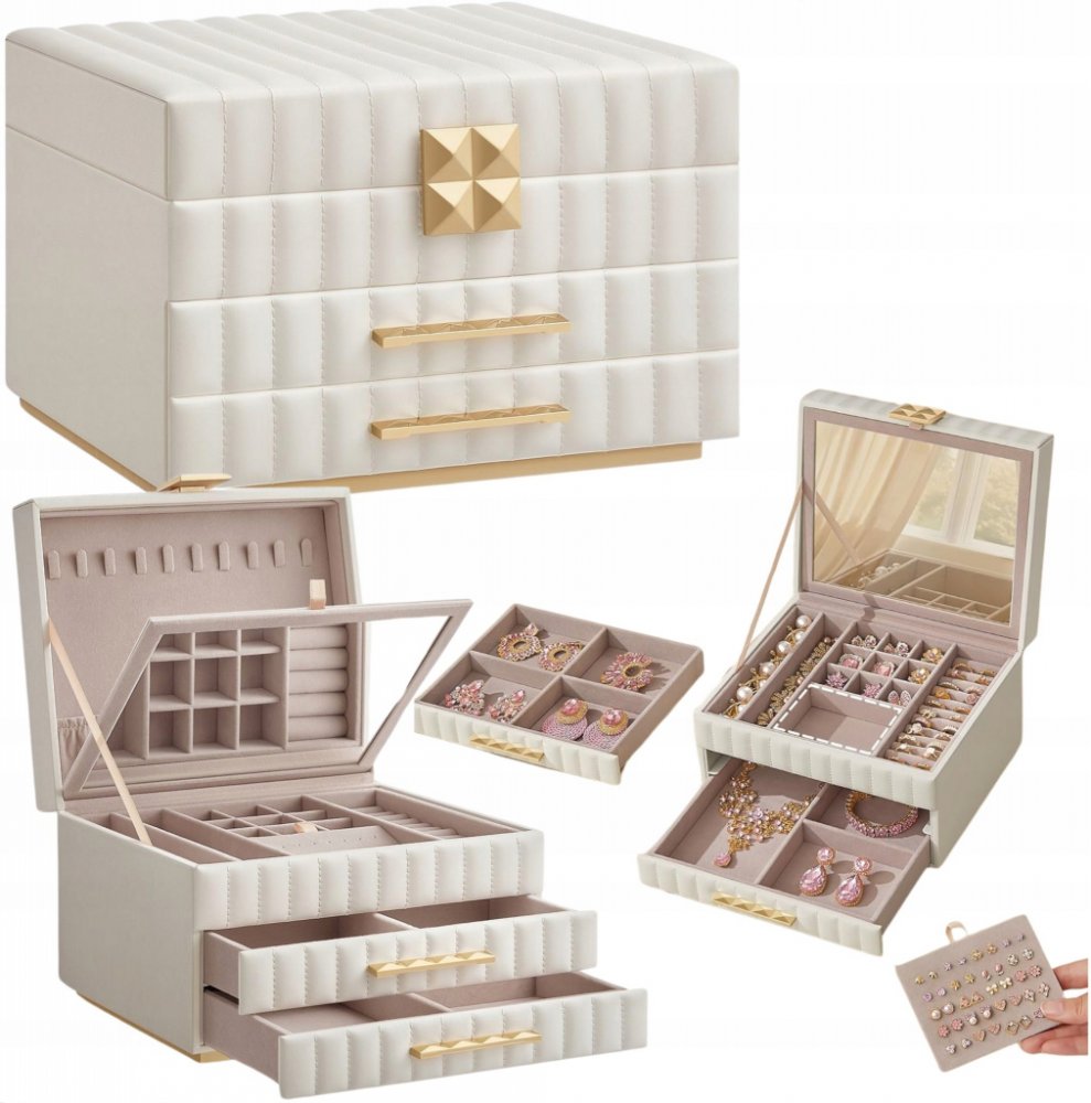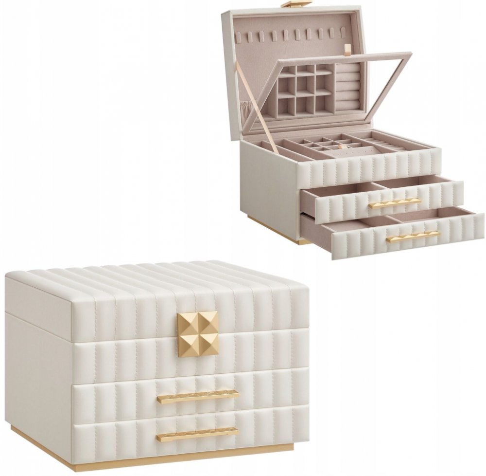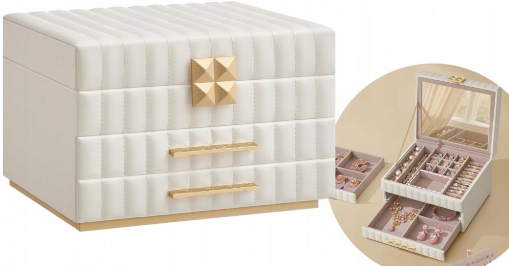 Tři úrovně poskytují rozmanité možnosti ukládání – víko s prostorem pro 10 náhrdelníků, horní podnos a dvě zásuvky s rozdělenými přihrádkami na náušnice, prsteny a náramky. Žádný šperk se nezamotá!