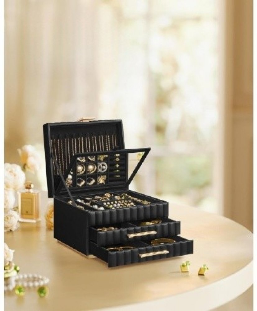 Víko třípatrové šperkovnice nabízí prostor až pro 10 náhrdelníků, zatímco horní přihrádka a 2 zásuvky jsou navrženy tak, abyste měli náušnice, prsteny a náramky přehledně uspořádané a nezamotané.