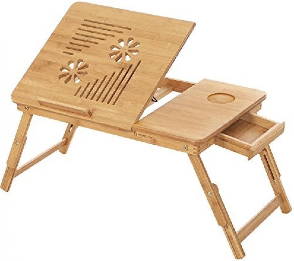 Užitečný a praktický stolek pro ty, kteří rádi čtou, studují, pracují pohodlně na posteli nebo na pohovce! Vhodný jak pro notebook, ale také pro příjemnou snídani v posteli. Stolek je vyroben výhradně z přírodního bambusu, je pevný a zároveň není objemný, jeho konstrukce je jednoduchá, velmi odolná a dobře zpracovaná. Nohy tohoto stolku jsou výškově nastavitelné, je jen na vás, jakou výšku budete potřebovat, aby vám zbyl dostatek místa pro nohy. Sklopnou desku stolku můžete nastavit v pěti různých polohách a je vhodná pro 15palcový notebook. Na vedlejší okládací ploše můžete používat myš nebo do vyřezaného odvoru odložit nápoj. Stolek má také malou boční zásuvku. Tento stolek má vzduchové otvory ve tvaru ventilátoru, které zajišťují dostatečné větrání a snižují pravděpodobnost přehřátí notebooku.
