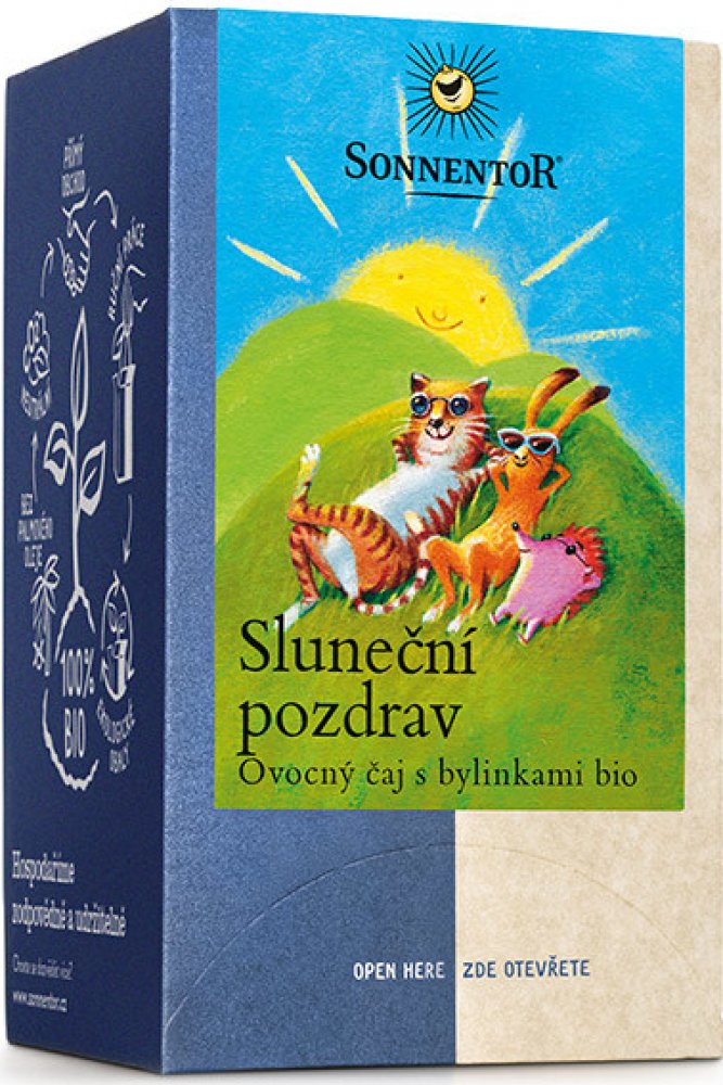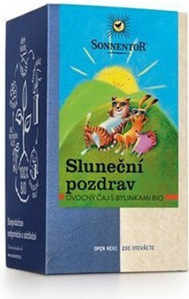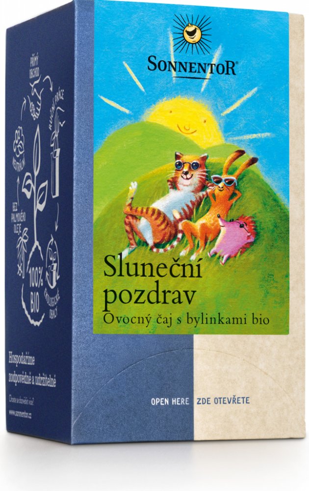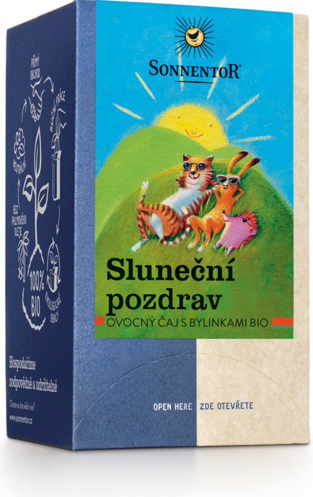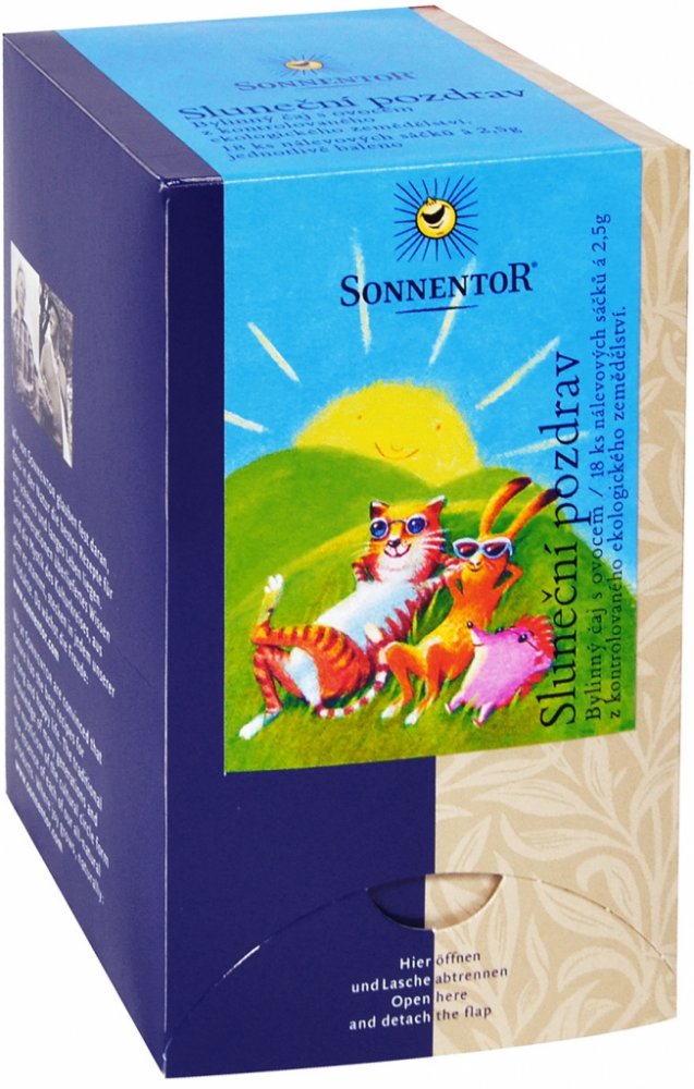 Čaj Sluneční pozdrav – „troška slunečních paprsků“. S touto směsí posílá SONNENTOR sluneční pozdravy. Jemná bylinno-ovocná směs má velmi harmonickou chuť, je osvěžující a šíří dobrou náladu. Díky jemně ovocné chuti je velmi oblíbená také u dětí. K dostání také jako sypaný čaj.