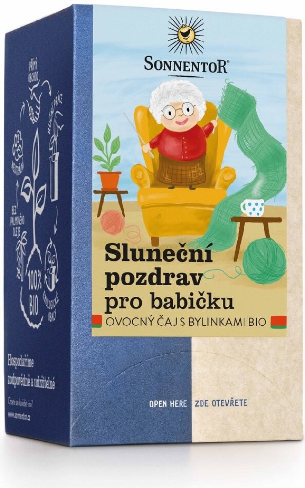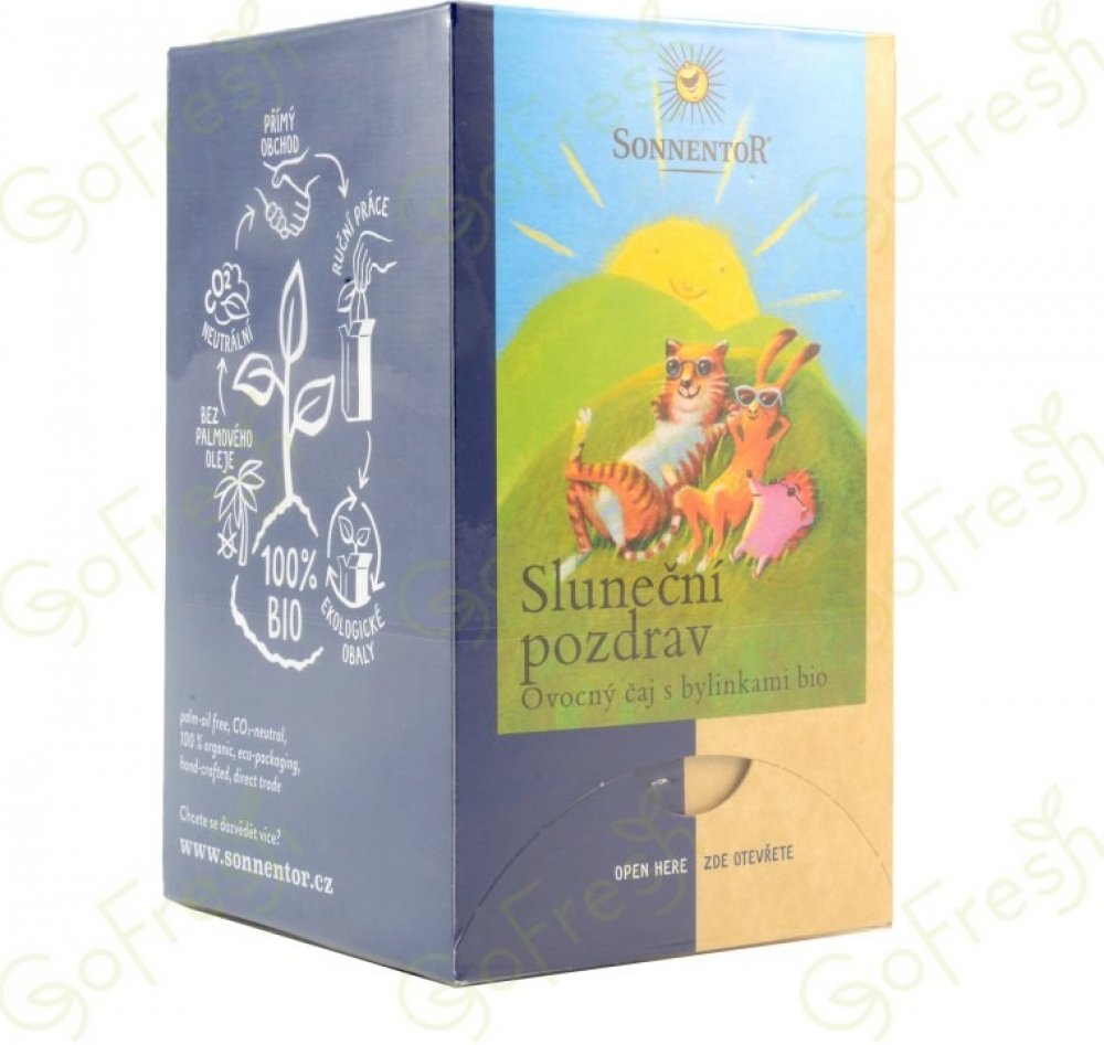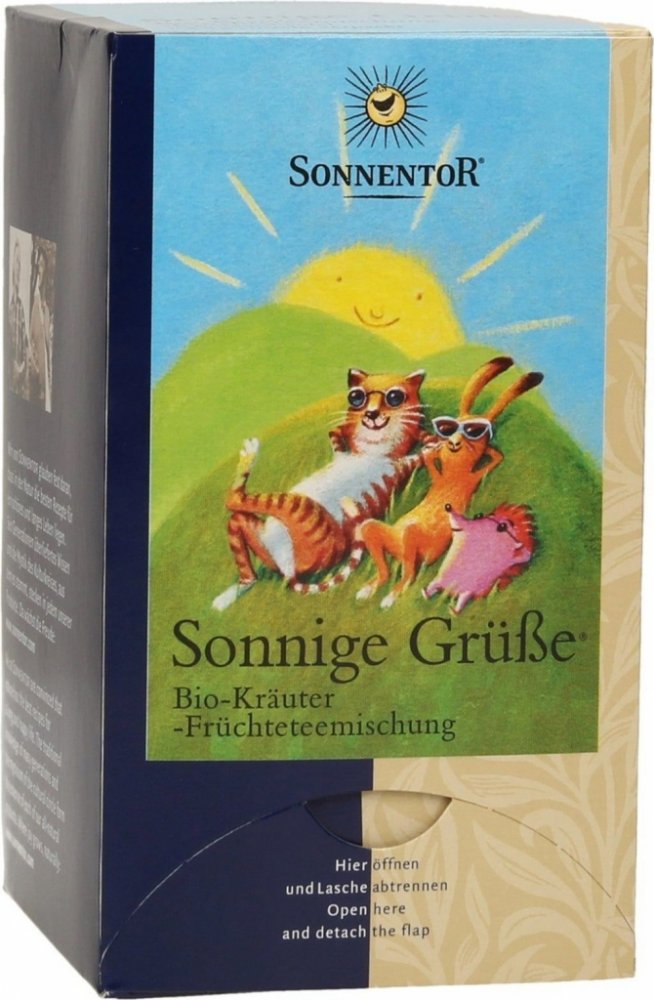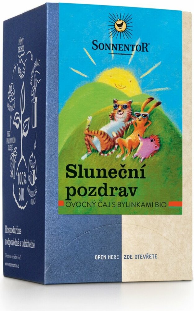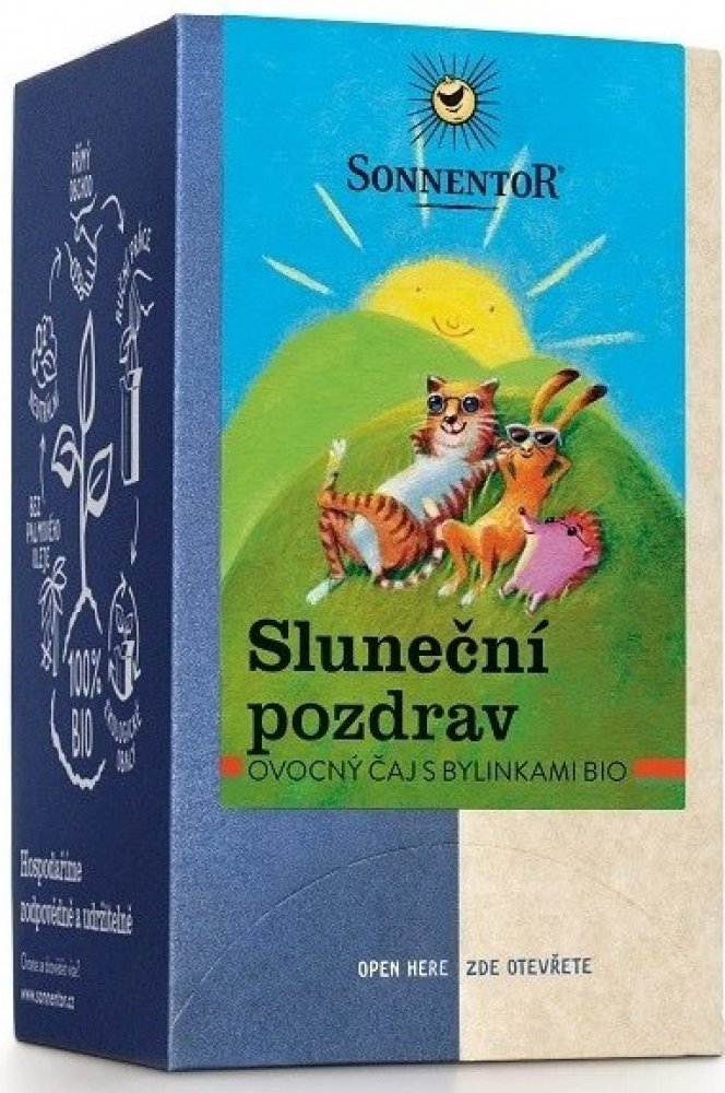 Čaj Sluneční pozdrav – „troška slunečních paprsků“. S touto směsí posílá SONNENTOR sluneční pozdravy. Jemná bylinno-ovocná směs má velmi harmonickou chuť, je osvěžující a šíří dobrou náladu. Díky jemně ovocné chuti je velmi oblíbená také u dětí. K dostání také jako sypaný čaj.