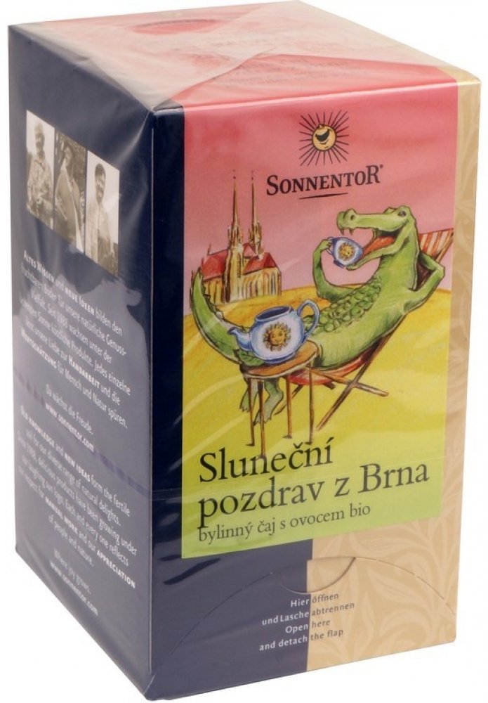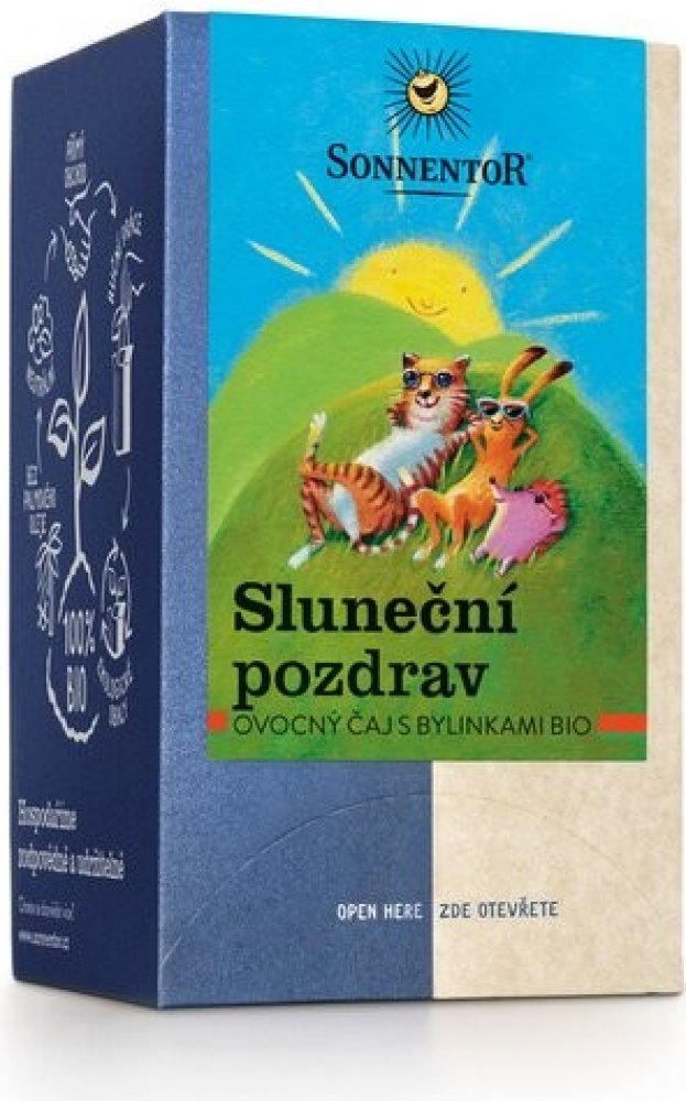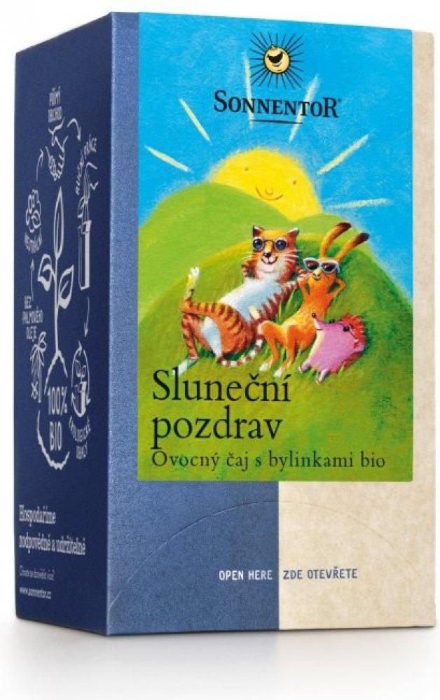 Tahle ovocno-bylinná lahoda chutná velkým i malým a smysly hýčká harmonickou chutí. Svěžestí zavane máta a citronová tráva, šťavnatou chuť léta připomenou kousky jahod a jablíček. Pozdraví vás i šípek s ibiškem, chrpa, sedmikráska a měsíček z biofarem a volného sběru. A co víc? V Sonnentoru čaj naporcovali do nálevových sáčků, které můžete po použití s klidem hodit na kompost.