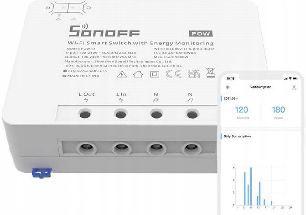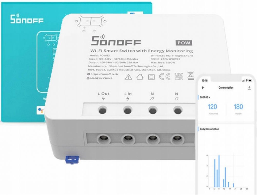 Zařízení Sonoff POW R3 navíc měří aktuální spotřebu elektrické energie, zobrazuje napětí (V), proud (A) a příkon (W), dokáže kumulované hodnoty zobrazit v přehledné historii po dnech a měsících a umožňuje data stáhnout do souboru.