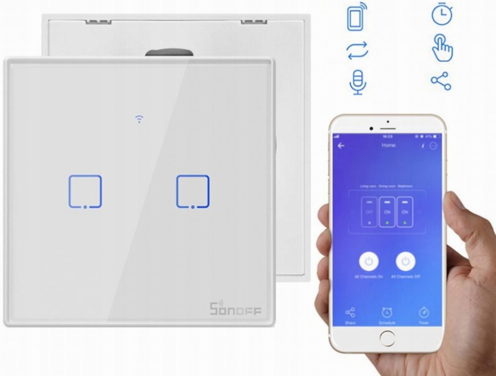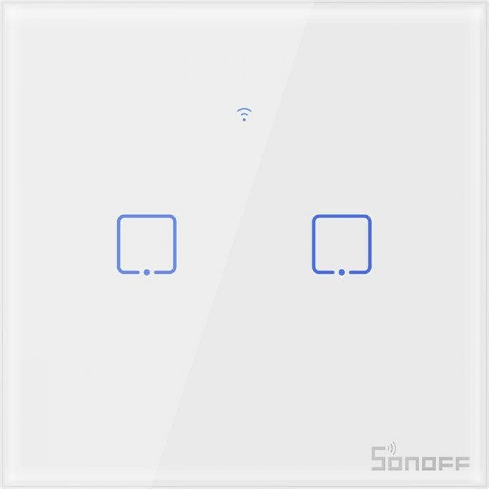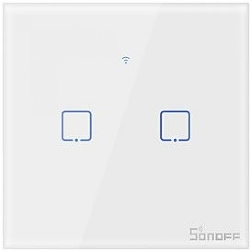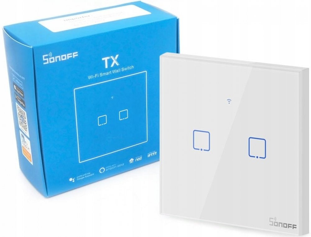 Dvojdotykový wifi spínač světla Sonoff Touch s možností přídavného dálkového ovládání 433MHz rádiem. Vypínač se vyznačuje elegantním designem - přední panel je vyroben z tvrzeného skla a nalezení vypínače ve tmě usnadňuje jemné modré podsvícení. Přepínač funguje se softwarem eWeLink, který je k dispozici pro zařízení iOS a Android. Aplikace umožňuje ovládat světlo a odečítat aktuální stav spínače, navíc je možné vytvářet časování, takže spínač zapíná a vypíná světla ve zvolený čas, a vytvářet scénáře a scény. Integrace spínačů se softwarem Amazon Alexa a Google Assistant umožňuje hlasové ovládání. Kompatibilita s technologií IFTTT zajišťuje spolupráci se systémy inteligentních budov třetích stran a ovládání osvětlení například v závislosti na čase východu slunce nebo přítomnosti osob v místnosti. Použití cloudu zajistilo, že přepínač lze ovládat odkudkoli na světě, ale i v případě, že přepínač nemá přístup k internetu nebo je připojení nekvalitní, je možné přepínač ovládat v interní síti LAN. Prodávaný přepínač je z nejnovější, výrazně vylepšené řady přepínačů Sonoff TX. Hlavní změnou je zlepšení citlivosti dotykových polí přepínače a změna designu přepínače. . . Specifikace:. Standard: EU. Napájecí napětí: 90~250V AC Maximální zatěžovací proud: 2A Maximální zatěžovací výkon: 400 W Barva: bílá. Wifi: 802.11 b/g/n Šifrování Wi-Fi: WPA-PSK/WPA2-PSK Materiál: tvrzené sklo + PC Počet kanálů: 2 Rádiové ovládání pomocí dálkového ovládání RF 433MHz Způsob montáže a připojení: K ovládání spínače jsou zapotřebí dvě linky N a L 230V. Pokud takovou instalaci nemáte, nabízíme také spínače, které fungují bez dalšího napájecího vedení. . . Vnější rozměry dotykového spínače Sonoff:. . . Film ukazuje, jak nainstalovat aplikaci eWeLink potřebnou pro spínače Sonoff:. https://youtu.be/wF2xPci1aDo . Jak spárovat dotykové spínače s aplikací eWeLink . https://youtu.be/exS7whmkXp8 Jak spárovat s rádiovým dálkovým ovladačem:. Držte dotykové tlačítko na vypínači, dokud neuslyšíte jedno pípnutí, poté tlačítko uvolněte a stiskněte tlačítko na dálkovém ovladači rádia, správné spárování bude potvrzeno pípnutím. Rádiové dálkové ovladače, se kterými jsou dotykové spínače Sonoff kompatibilní :. Poznámka: dálkové ovládání není součástí dodávky.. Výkon schodišťového spínače:. Rádiový přijímač zabudovaný ve vypínačích umožňuje ve spojení s dálkovými ovladači, které vypadají jako vypínače světel, vytvořit schodišťový spínač.