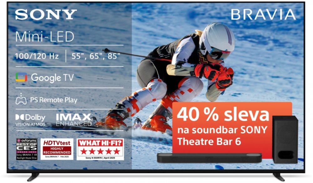 Doporučené k tomuto modeluS chytrou televizí Sony Bravia 7 se budete cítit jako v kině Nová Sony Bravia 7 je tu a s ní i bezkonkurenční požitek ze sledování, který udělá z všeho obývacího pokoje vaše privátní kino. Díky platformě Google můžete sledovat ohromné množství filmů a seriálů nebo využívat řadu aplikací. Využitím moderních technologií a algoritmů si na 65palcové obrazovce s 4K rozlišením užijete hladký a detailní obraz v realistických barvách i při vysoké úrovni jasu - obsah tak budete sledovat přesně tak, jak tvůrci zamýšleli. K internetu televizi Sony Bravia 7 připojíte buďto přes LAN kabel anebo pomocí bezdrátové WiFi. O zážitek jako v kinosále se starají technologie Dolby Vision a Dolby Atmos. Prostorový zvuk s paprskovým výškovým reproduktorem snese i to nejpřísnější měřítko. Chytrá TV Sony podporuje více formátů vysokého dynamického rozsahu, například HLG i HDR10. Pro uchycení televize na stěnu poslouží držák standardu VESA 300 × 300 mm.Není vyplněn Alternativní text k...