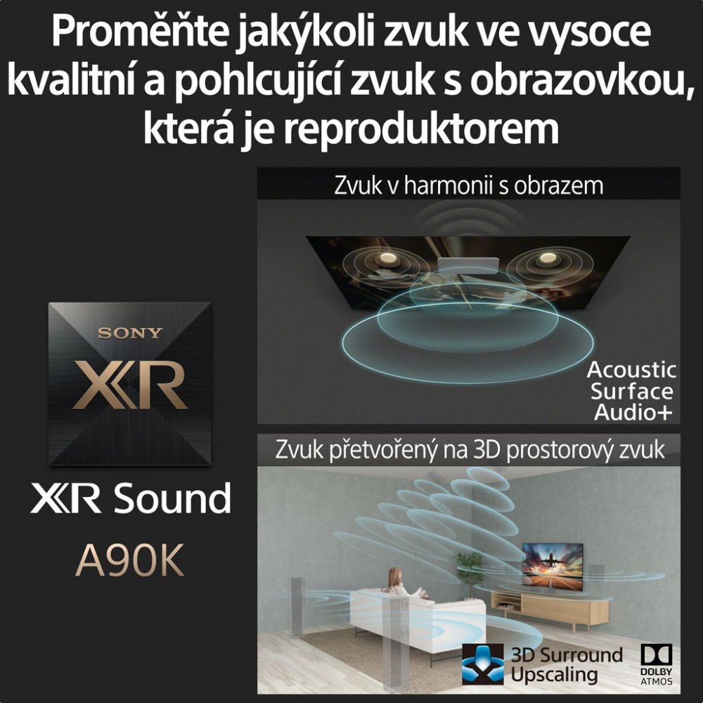Televizory BRAVIA XR nabízejí pohlcující zážitek a chrání životní prostředí. Při výrobě televizorů a obalů využíváme méně prvotních plastů. Na výrobu zadního krytu televizoru A90K byl použit materiál SORPLAS™ (s mírou recyklovatelnosti až 85 %) od Sony. Naše jedinečné technologie podsvícení, kamera BRAVIA CAM a snímače zajišťují vysokou kvalitu obrazu a také snižují spotřebu energie.