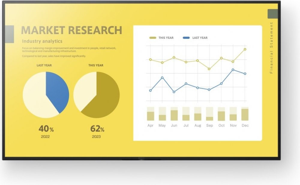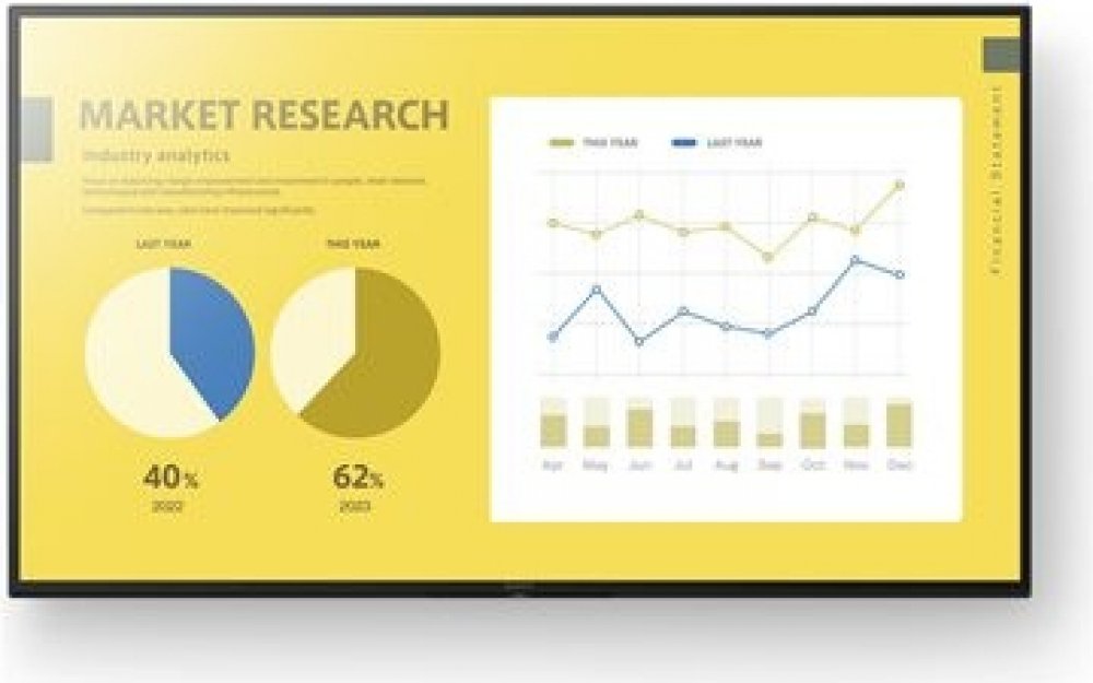 Velkoformátový displej můžete využít při různých marketingových akcích jako billboard, v showroomech či v zasedacích místnostech pro prezentace. Dobře poslouží také na kontrolních stanovištích pro sledování provozu linek nebo kamerového systému. Tento LCD velkoformátový displej SONY má úhlopříčku 75" a 4K (3840 × 2160) rozlišení. Díky jemnému vykreslení je vhodný pro filmové ukázky, prezentaci gra...