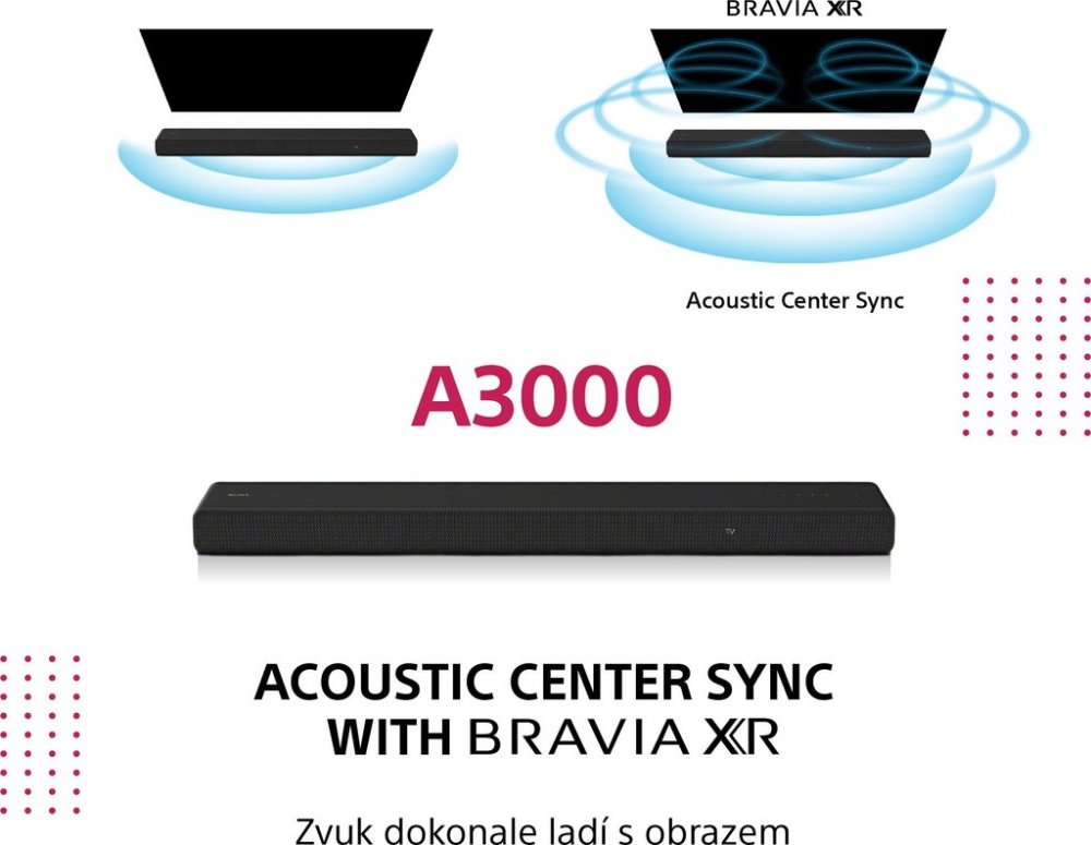 3.1 Zvukový systém Soundbar určený pro zkvalitnění reprodukce zvuku TV. Soundbar je vybavený 3mi reproduktory pro věrné podání zvuku. Subwoofer je integrovaný do soundbaru a jedinečný design nic neruší. Soundbar je vybaven technologiemi 360 spatial sound mapping, Sound field optimalisation, Vertical Surround Engine, S-Force Pro, Dolby Atmos, DTS:X a podporuje 360° Reality Audio a DSEE Extreme pro vylepšení nekvalitních zvukových stop. Díky podpoře 8K, 4K 120fps a Dolby Vision jsou scény živé, plné realistických barev a hloubek. Soundbar lze dodatečně vybavit subwooferem SA-SW5, nebo SA-SW3 a bezdrátovými zadními reproduktory SA-RS3, případně SA-RS5. Bezdrátové připojení Bluetooth a Wifi. Chromecast Built-in, Apple AirPlay2, Spotify Connect a Google Assistant. S vybranými televizory Sony Bravia, lze využít technologii Acoustic Center Sync, kdy se z televize stane středový reproduktor celého systému. Barva černá.