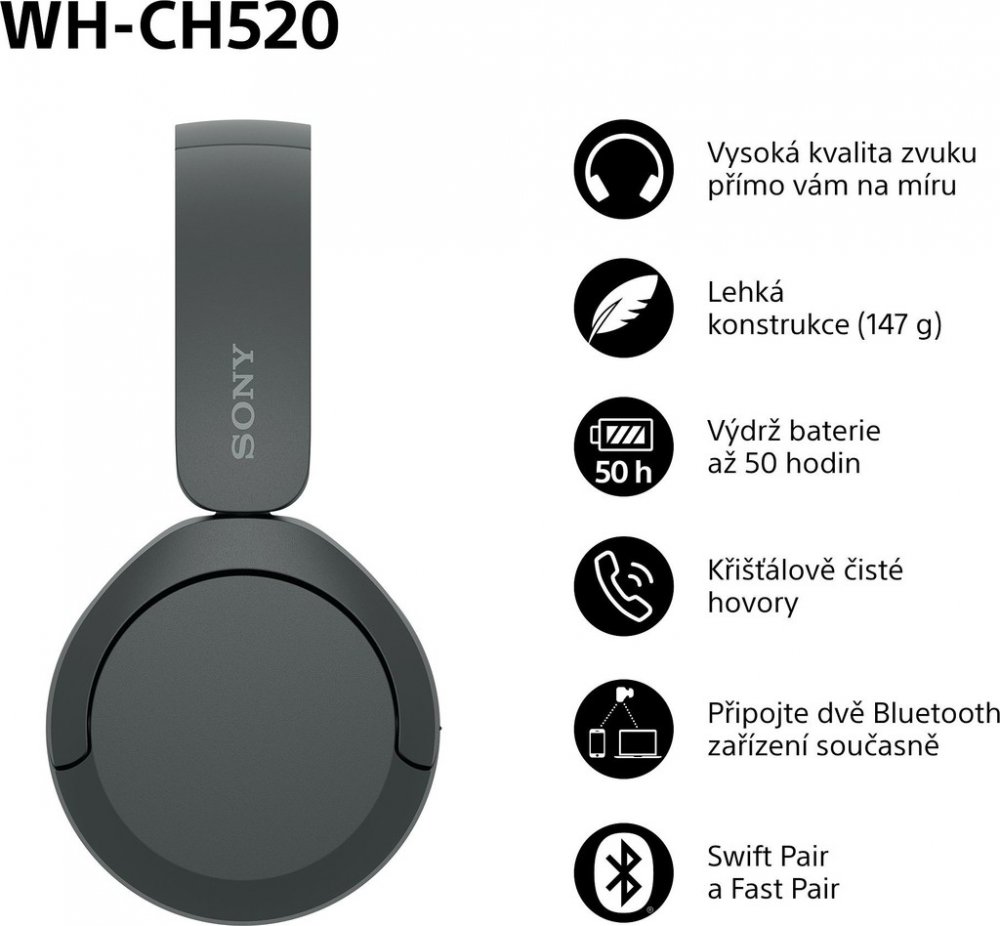 Sluchátka Sony Bluetooth WH-CH520 lze snadno spárovat s vaším zařízením díky technologii Bluetooth 5.2 a funkcím Swift Pair a Fast Pair. Možnost připojení k více zařízením znamená flexibilitu při přepínání mezi různými zdroji zvuku.