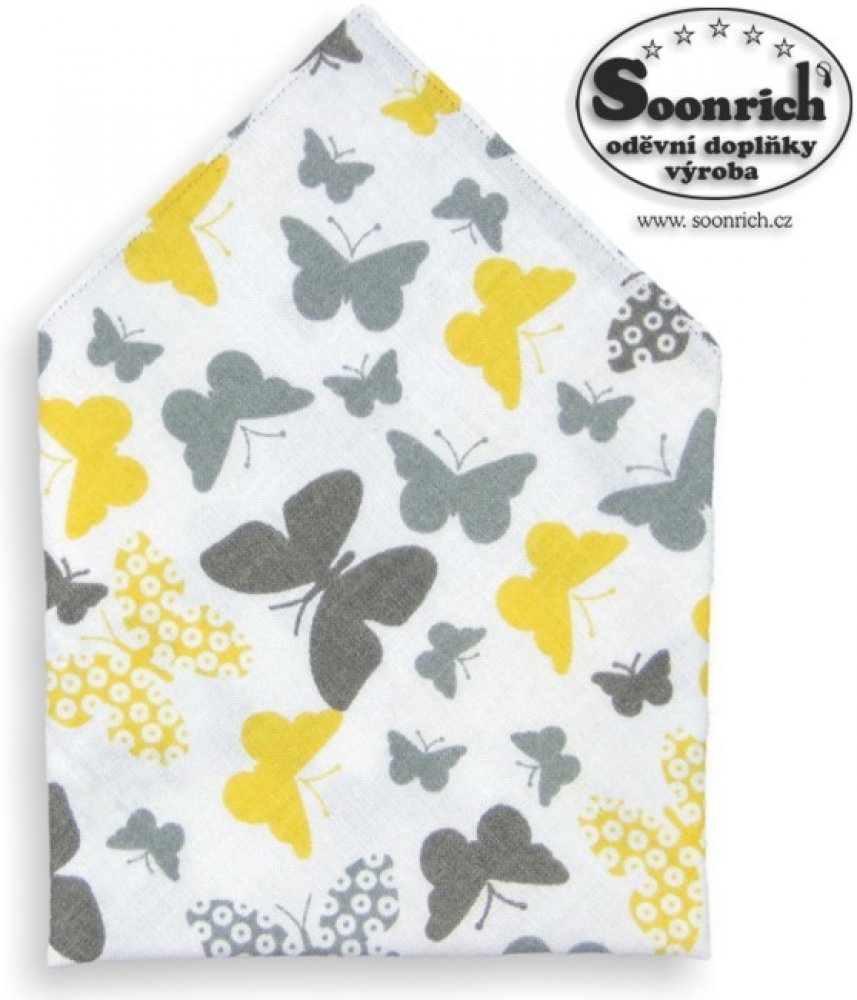 bavlněný kapesník šedé motýlky, materiál: 100% bavlna, rozměr: 20 x 20 cm, vzor: motýlky, motýlek 1-3 cm, barva: šedá, žlutá , Pánský, chlapecký kapesníček do klopy saka je vyrobený z kvalitního bavlněného plátna. Bavlněný kapesníček se vzorem maskáčů má originální vzhled. Bavlněné kapesníčky jsou ušité ve tvaru čtverce a dají se poskládat do saka několika různými způsoby, např. špičky, květy. Kapesník z bavlny je vhodným módním doplňkem pro jakoukoliv příležitost, karnevalová nebo retro párty. Maskáčové kapesníky se používájí k nošení v klopě saka a barevně sladěné s kravatou nebo motýlkem. Na kapesníčky se mohou vyšívat různé monogramy či loga. Bavlněné kapesníky šijeme v široké škále barevných odstínů a můžete je využít pro teambuildingové a firemní akce. K bavlněnému kapesníku také koupíte kravatu, motýlek nebo šátek stejné barvy a materiálu, viz. náhledy níže.