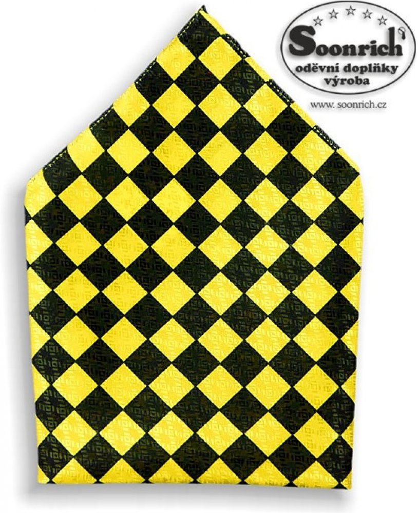 kapesník žlutá šachovnice, materiál: 100% polyester tkaný, rozměr: 20 x 20 cm, vzor: šachovnice, kostka 1 x 1 cm, barva: černá, žlutá , Pánský, chlapecký kapesníček do klopy saka je ručně potištěný vlastním originálním motivem. Dezén kapesníčku může být natištěn na hladkém nebo tkaném materiálu s geometrickým či proužkovaným povrchem. Každý kapesníček má natištěnu ochrannou značku originality. Originální kapesníky tiskneme, stříháme a šijeme samostatně v limitovaném množství. Kapesníčky jsou ušité ve tvaru čtverce a dají se poskládat do saka několika různými způsoby, např. špičky, květy. Kapesník s originálním vzorem má netradiční vzhled a je vhodným módním doplňkem pro jakoukoliv příležitost (plesy, svatby, zaměstnání, párty). Pánské kapesníky se používájí k nošení v klopě saka a barevně sladěné s kravatou nebo motýlkem. Kapesníky šijeme v široké škále barevných odstínů a můžete je využít pro teambuildingové a firemní akce. K originálnímu kapesníku také koupíte kravatu nebo motýlek stejné barvy a materiálu, viz. náhledy níže.