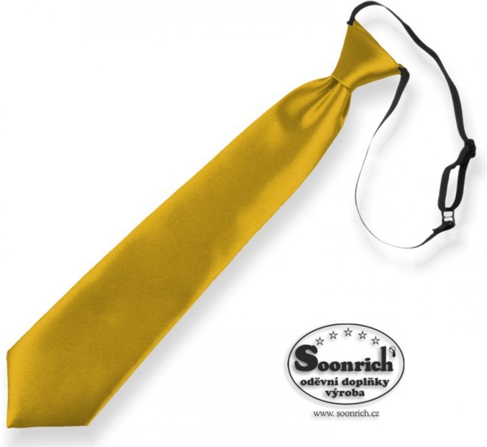kravata dětská zlatá na gumičku, materiál: 100% polyester - satén, délka: 30 nebo 40 cm, šířka: 5 cm, obvod gumy: 20 - 30 cm, vzor: jednobarevný, barva: zlatá , Dětská kravata je vyrobená z lesklého saténového materiálu. Jednobarevná kravata se snadno ladí ke košilím s proužkem, kostičkou nebo jiným vzorům. Dětské kravaty šijeme ve dvou délkách. Kratší kravata je vhodná pro děti od 3 let a delší kravata pro děti školního věku. Kravata pro děti je ušitá se stahovací černou nebo bílou gumou a nemusí se vázat. Kravaty pro děti jsou vhodným doplňkem na zahájení nebo ukončení školního roku, narozeninové a slavnostní příležitosti. K dětské kravatě můžete také koupit regatu, kapesníček, motýlek či vázací kravatu, stejné barvy a materiálu, viz. náhled níže.
