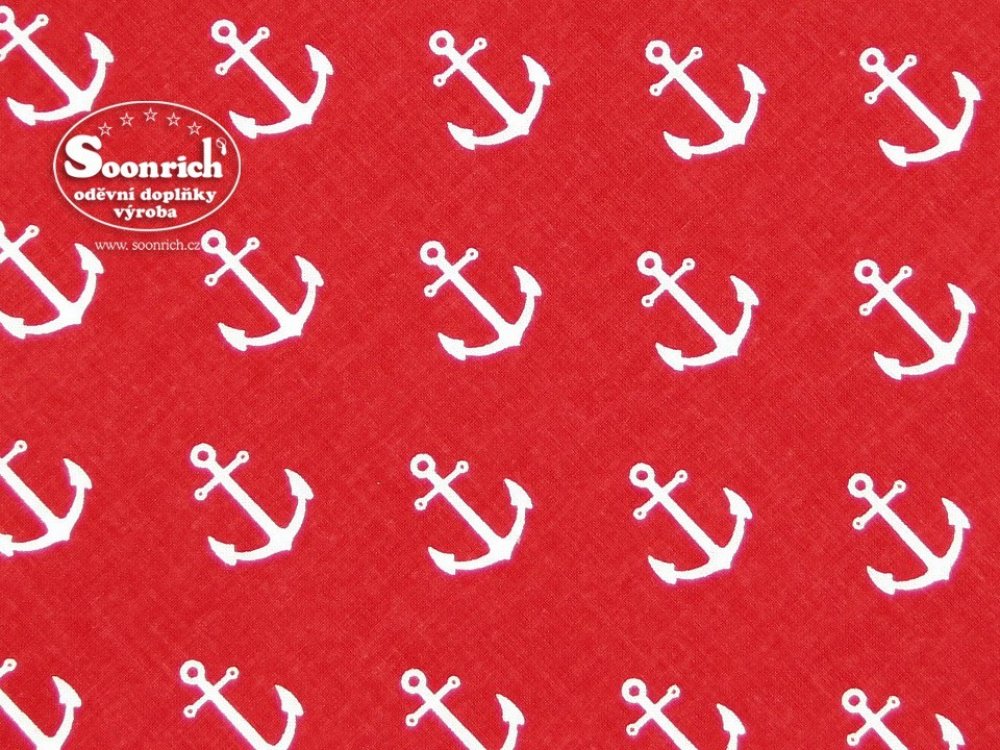 látka na patchwork bílé kotvy na červené, materiál: 100% bavlna, rozměr: 100 x 20 cm, vzor: kotva 25 mm, barva: bílá, červená , Látka na patchwork je vyrobená z kvalitního 100 % bavlněného plátna. Bavlněné