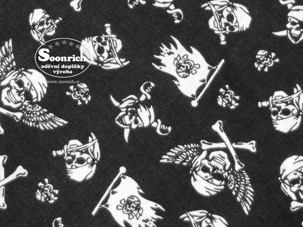látka na patchwork pirátské lebky, materiál: 100% bavlna, rozměr: 100 x 20 cm, vzor: lebka 2 - 5 cm, pirát, hnáty, kosti, meče, barva: bílá, černá , Látka na patchwork je vyrobená z kvalitního 100 % bavlněného plátna. Bavlněné