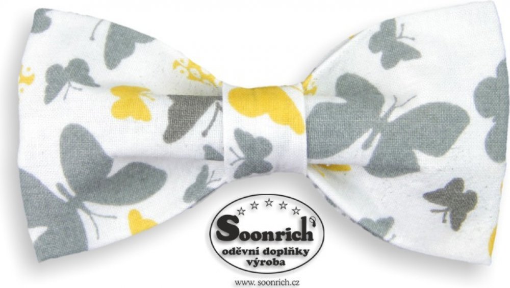 motýlek šedé motýlky, materiál: 100% bavlna, rozměr: 10 x 5 cm nebo 8 x 4 cm, obvod gumy: 45 cm, vzor: motýlky, motýlek 1-3 cm, barva: šedá, žlutá , Dámský, pánský nebo dětský motýlek je vyrobený z kvalitního bavlněného plátna. Bavlněný motýlek šijeme v klasickém rovném tvaru a ve dvou rozměrech. Větší velikost motýlku 10 x 5 cm je určena pro dámy, pány a chlapce. Menší velikost motýlku 8 x 4 cm j...