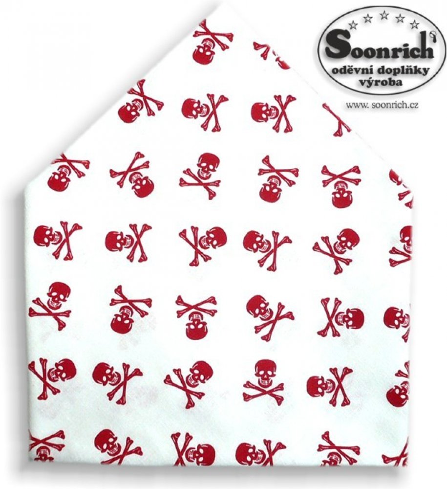 šátek dětský červené lebky, materiál: 100% bavlna, rozměr: 45 x 45 cm, vzor: lebky 20 mm barva: červená, bílá, , Dětský čtyřcípý šátek je vyroben z kvalitního bavlněného plátna. Dětské bavlněné šátky šijeme v široké paletě barev a vzorů s puntíky, kytičkami, proužky, jednobarevné, lebkami, piráty, srdíčky, kotvami, smajlíky, maskáči, námořnickými, motorkářskými, hudebními motivy a mnoho dalších. Dětský šátek z bavlny můžeme uvázat na hlavu a přeložením do trojúhelníku také kolem krku. Plátěný šátek se nosí jako módní doplněk a zároveň chrání před nachlazením. Bavlněný šátek je vhodný doplněk pro děti od 3 let na běžné nošení nebo dětské a skautské tábory. Šátek může také sloužit jako bavlněná rouška přes pusu a nos. K dětskému bavlněnému šátku můžete také koupit pirátský šátek, čelenku, kravatu, tašku, kapesník nebo motýlek stejné barvy, vzoru a materiálu, viz. náhledy níže. Na zakázku vám rádi ušijeme čtyřcípé nebo trojcípé šátky dle vámi zadaného rozměru.