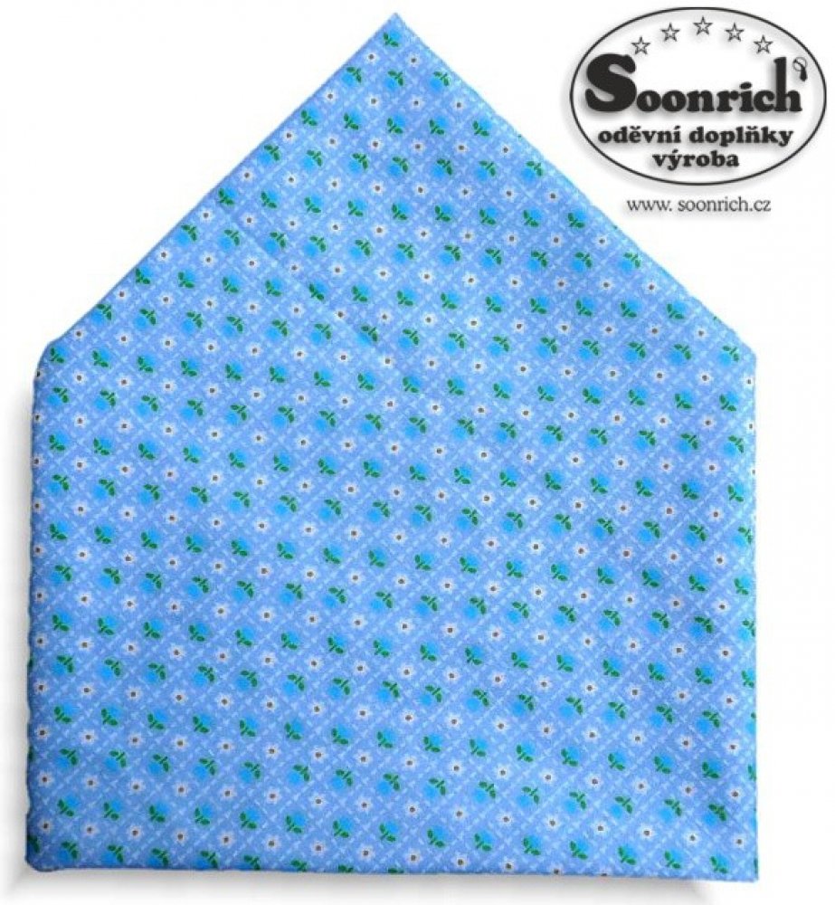 šátek dětský kytičky , materiál: 100% bavlna, rozměr: 45 x 45 cm, vzor: květiny, kytky, kytičky, barva: modrá, zelená, bílá , Dětský čtyřcípý šátek je vyroben z kvalitního bavlněného plátna. Dětské bavlněné šátky šijeme v široké paletě barev a vzorů s puntíky, kytičkami, proužky, jednobarevné, lebkami, piráty, srdíčky, kotvami, smajlíky, maskáči, námořnickými, motorkářskými, hudebními motivy a mnoho dalších. Dětský šátek z bavlny můžeme uvázat na hlavu a přeložením do trojúhelníku také kolem krku. Plátěný šátek se nosí jako módní doplněk a zároveň chrání před nachlazením. Bavlněný šátek je vhodný doplněk pro děti od 3 let na běžné nošení nebo dětské a skautské tábory. Šátek může také sloužit jako bavlněná rouška přes pusu a nos. K dětskému bavlněnému šátku můžete také koupit pirátský šátek, čelenku, kravatu, tašku, kapesník nebo motýlek stejné barvy, vzoru a materiálu, viz. náhledy níže. Na zakázku vám rádi ušijeme čtyřcípé nebo trojcípé šátky dle vámi zadaného rozměru.