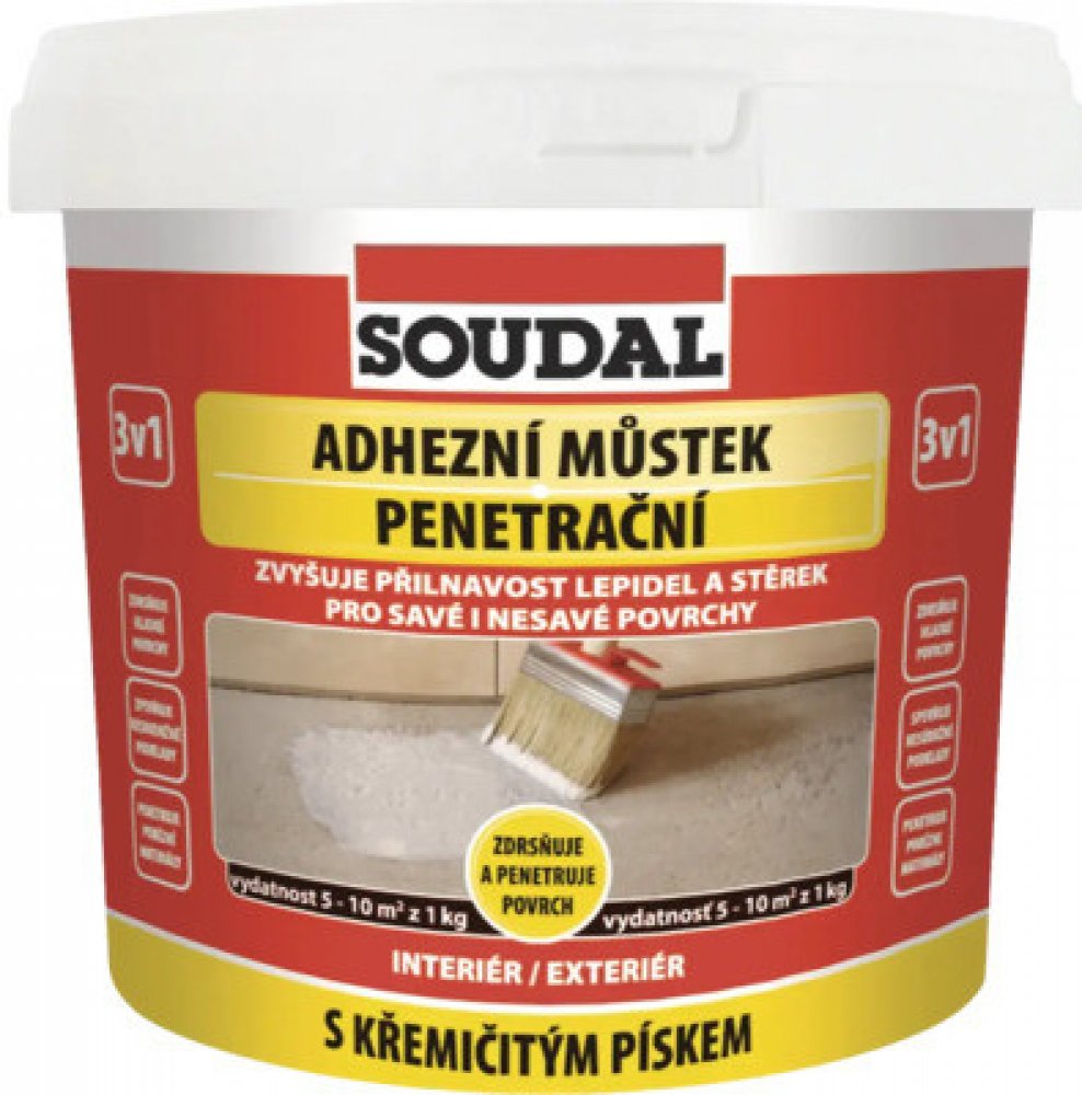 Adhezní můstek SOUDAL je speciální podkladový nátěr s křemičitým pískem pro zvýšení přilnavosti hydroizolačních a vyrovnávacích hmot k problematickým podkladům. Je vhodný pro úpravu savých i nesavých podkladů. Na povrchu vytváří adhezní můstek SOUDAL strukturu, která dokonale přilne k podkladu.