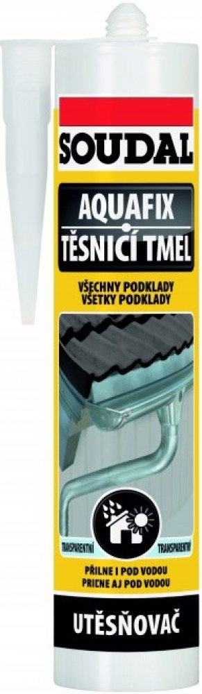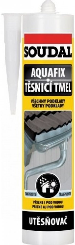 Vodotěsné tmelení prasklin a spár s pohybem do 10%, opravy netěsných okapů a svodů, odpadových rour, spáry a těsnění kolem střešních oken, havarijní opravy i za deště, stavební spáry ve vlhkém prostředí. Vlastnosti Soudal Aquafix těsnící tmel proti vodě: 100% transparentní (čirý), velmi snadno použitelný, obsahuje rozpouštědla, velmi dobrá přilnavost ke většině materiálů (asfalt, beton, kovy, sklo, kámen, dřevo, plasty), vhodný pro všechny typy střešních krytin, přilne i na mokré podklady, po vytvrzení přetíratelný, odolný UV záření, vodě i ostatním povětrnostním vlivům, Smrštění cca 20%. Podklady: Vhodné povrchy: většina stavebních materiálů. Stav povrchu: čistý, bez mastnot a prachu, může být mokrý. Příprava: není vyžadována. Doporučujeme vždy provést předběžný test přilnavosti. Pracovní postup: Nanášení: aplikační pistolí (ruční nebo pneumatickou). Pracovní teplota: +5 °C až +30 °C. Úpravy: Vyhlazujte pomocí mýdlové vody. Čištění: Bezprostředně po aplikaci použijte White Spirit (lakový benzín) nebo aceton. Opravy: stejným materiálem. Bezpečnost: Dodržujte běžné podmínky bezpečnosti a hygieny práce, další informace viz. bezpečnostní list výrobku a údaje uvedené na etiketě.Bezpečnostní upozornění produktu (H-věty)EUH066: Opakovaná expozice může způsobit vysušení nebo popraskání kůže.H226: Hořlavá kapalina a páry.H336: Může způsobit ospalost nebo závratě.Pokyny pro bezpečné zacházení (P-věty)P101: Je-li nutná lékařská pomoc, mějte po ruce obal nebo štítek výrobku.P102: Uchovávejte mimo dosah dětí.P210: Chraňte před teplem, horkými povrchy, jiskrami, otevřeným ohněm a jinými zdroji zapálení. Zákaz kouření.P261: Zamezte vdechování prachu/dýmu/plynu/mlhy/par/aerosolů.P280: Používejte ochranné rukavice/ochranný oděv/ochranné brýle/obličejový štít.P303+P361+P353: PŘI STYKU S KŮŽÍ (nebo s vlasy): Veškeré kontaminované části oděvu okamžitě svlékněte. Opláchněte kůži vodou/osprchujte.P304+P340: PŘI VDECHNUTÍ: Přeneste osobu na čerstvý vzduch a ponechte ji v poloze usnadňující dýchání.P312: Necítíte-li se dobře, volejte TOXIKOLOGICKÉ INFORMAČNÍ